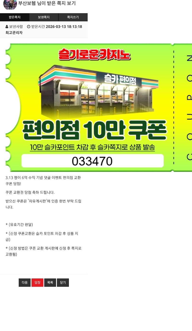 펭이 수익 ㅅ편의점 쿠폰 부산보헴 2 0 0 18:43:30 *기프티콘 바코드 노출 주의* <- 펭이 나이스샷 고마웡 ^^ 0 0 https://seulca1.com/bbs/board.php?bo_table=free&wr_id=3678377 Author 2 0 Lv.14 부산보헴 14 25,460,049 (35%) 부산보헴님 보유 포인트 : P 1,113,468 +2 03.13 펭이 수익 ㅅ편의점 쿠폰 +12 03.13 반페 황금아이템 883배 +16 03.12 할배천 다이스 166배 +36 03.12 할배다이스천 156배 +12 03.11 롤링 5000배