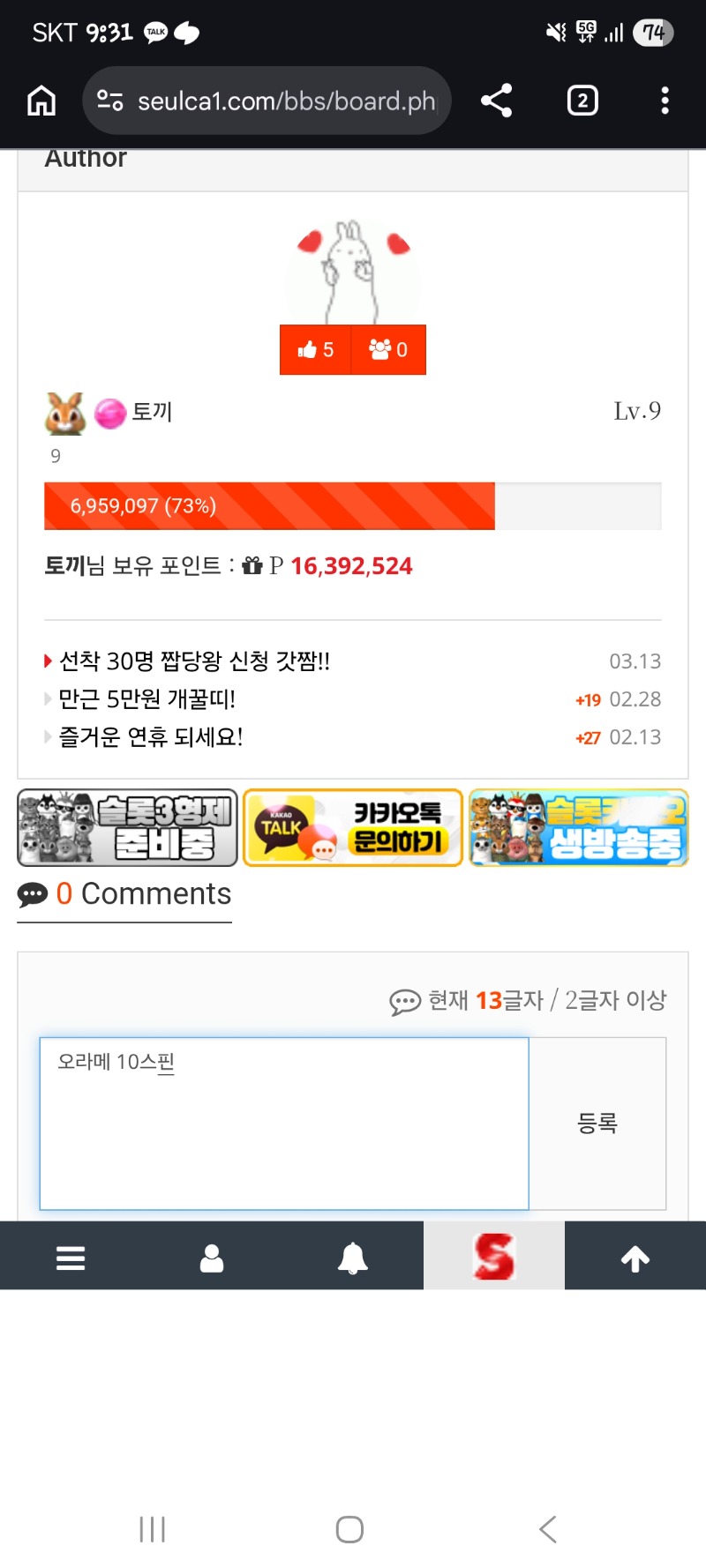 장난하나이거 ㅋㅋㅋㅋㅋ 파이리 14 0 0 21:33:32 *기프티콘 바코드 노출 주의* <- 이랬는데 ㅋㅋㅋㅋ 글적고나니 76번째 ㅋㅋㅋ 0 0 https://seulca1.com/bbs/board.php?bo_table=free&wr_id=3678957 Author 2 1 Lv.12 파이리 12 17,495,199 (89%) 파이리님 보유 포인트 : P 1,600 +8 03.13 96연꽝에서 일복당첨 ㅋㅋㅋㅋㅋㅋ +14 03.13 장난하나이거 ㅋㅋㅋㅋㅋ +10 03.13 엥 토끼야 !! 나지금 봤는데 이거머니?? +2 03.13 93연꽝~ +18 03.13 92연꽝~~~