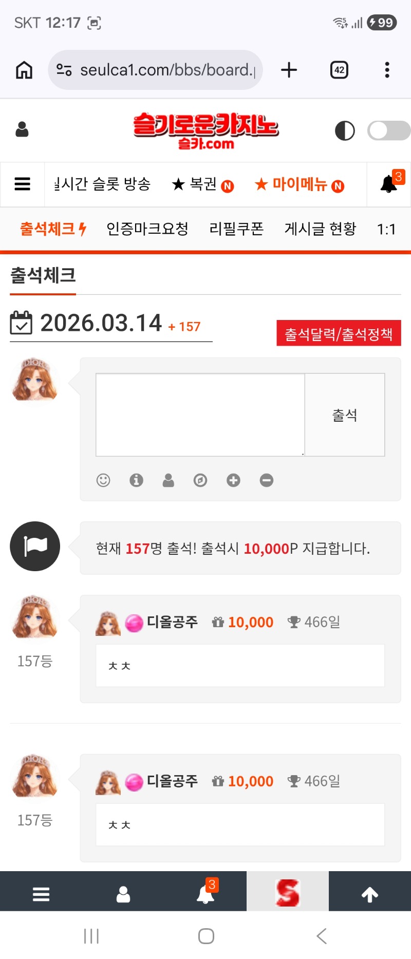 출첵 ^^ 디올공주 0 0 0 00:18:05 *기프티콘 바코드 노출 주의* <- 0 0 https://seulca1.com/bbs/board.php?bo_table=free&wr_id=3679338 Author 23 15 Lv.19 디올공주 19 199,841,628 (0%) 디올공주님 보유 포인트 : P 2,039,720 +2 03.14 에휴 3연패ㅠㅠ +2 03.14 황템당첨금 2패 +2 03.14 황템당첨금 패 03.14 출첵 ^^ +14 03.14 카지노 헤이스트 100배