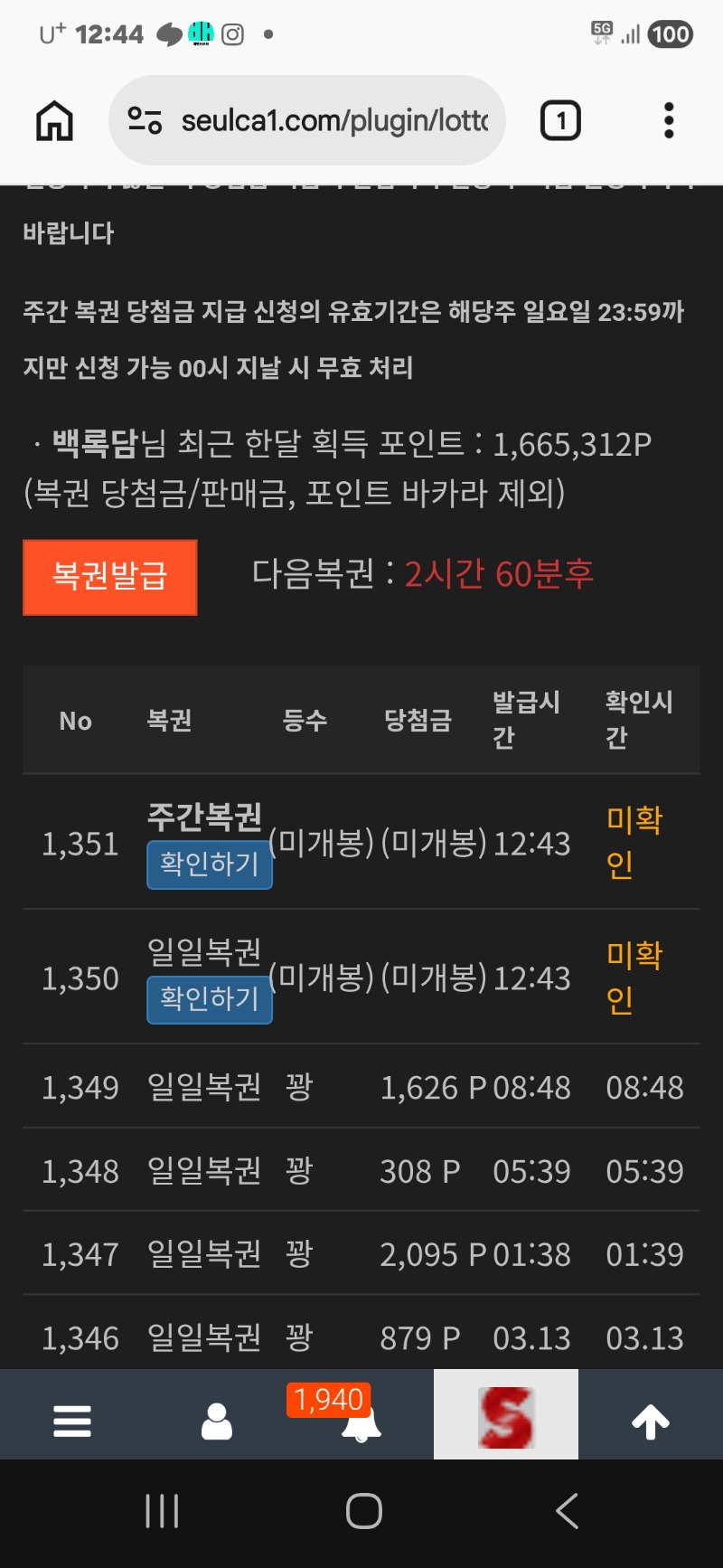 100 연꽝을 향한 발건음은 계속진행중~!! 백록담 4 0 0 12:48:15 0 0 https://seulca1.com/bbs/board.php?bo_table=free&wr_id=3680235 Author 0 0 Lv.11 백록담 11 11,977,239 (65%) 백록담님 보유 포인트 : P 154,124 +1 03.14 최바비 참가비도 모아놧고..호랭이 .비버 쌍으로또 거꾸로일등은 아니긋지?? +9 03.14 얼척읍네 이기고잇는걸 다시 내려뿌노.하~~ +9 03.14 숫자를같은걸주든가 나를 뒤집어주냐?? +9 03.14 1도모자라 0 을 만드냐?? +4 03.14 100 연꽝을 향한 발건음은 계속진행중~!!
