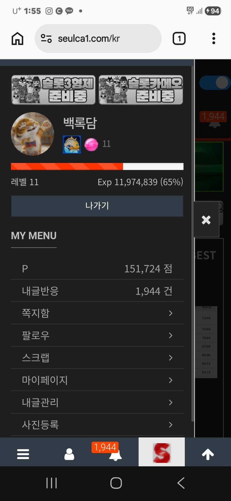 최바비 참가비도 모아놧고..호랭이 .비버 쌍으로또 거꾸로일등은 아니긋지?? 백록담 1 0 0 13:59:00 *기프티콘 바코드 노출 주의* <- 어라..칭구들이 3쌍으로 휴가네? 랑.비.달 ?? 0 0 https://seulca1.com/bbs/board.php?bo_table=free&wr_id=3680413 Author 0 0 Lv.11 백록담 11 11,994,639 (66%) 백록담님 보유 포인트 : P 171,738 +1 03.14 최바비 참가비도 모아놧고..호랭이 .비버 쌍으로또 거꾸로일등은 아니긋지?? +12 03.14 얼척읍네 이기고잇는걸 다시 내려뿌노.하~~ +12 03.14 숫자를같은걸주든가 나를 뒤집어주냐?? +12 03.14 1도모자라 0 을 만드냐?? +4 03.14 100 연꽝을 향한 발건음은 계속진행중~!!