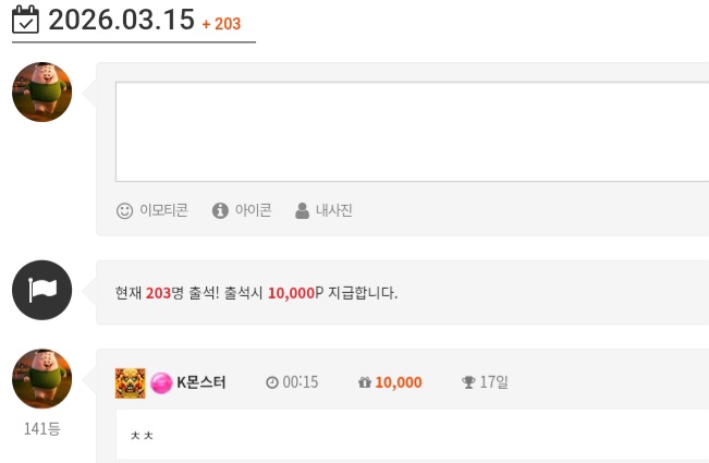 출석체크 K몬스터 0 0 0 00:38:39 *기프티콘 바코드 노출 주의* <- 이모만나야해서 ㅋㅋ 0 0 https://seulca1.com/bbs/board.php?bo_table=free&wr_id=3681995 Author 12 3 Lv.15 K몬스터 15 40,609,421 (53%) K몬스터님 보유 포인트 : P 2,449 03.15 출석체크 03.14 야심한시간 오늘도 난 이모를찾는다~ +6 03.14 오늘은 당첨좀안되겠니?? ㅋㅋ +12 03.13 슬왕 조기종료 ㅎ +38 03.12 건담1127배