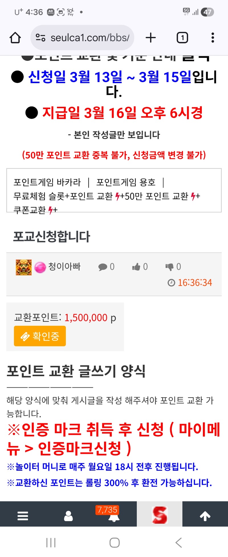겨우겨우 150만포교 성공 청이아빠 9 0 0 16:38:24 *기프티콘 바코드 노출 주의* <- 휴......... 진짜 힘들었네 500만 포교 못해서 아쉽지만 그래도 포기했다가 포교해서 다행이라고 생각 휴~~ 0 0 https://seulca1.com/bbs/board.php?bo_table=free&wr_id=3684114 Author 0 0 Lv.15 청이아빠 15 33,305,757 (16%) 청이아빠님 보유 포인트 : P 15,610 +9 03.15 겨우겨우 150만포교 성공 +1 03.15 [비밀글] 포교신청합니다 +3 03.15 참가비 납부완료^^ +1 03.15 다들 문카 돌발 수익나세요^^ +39 03.15 바카라 패 ~ 0이면 못이기지