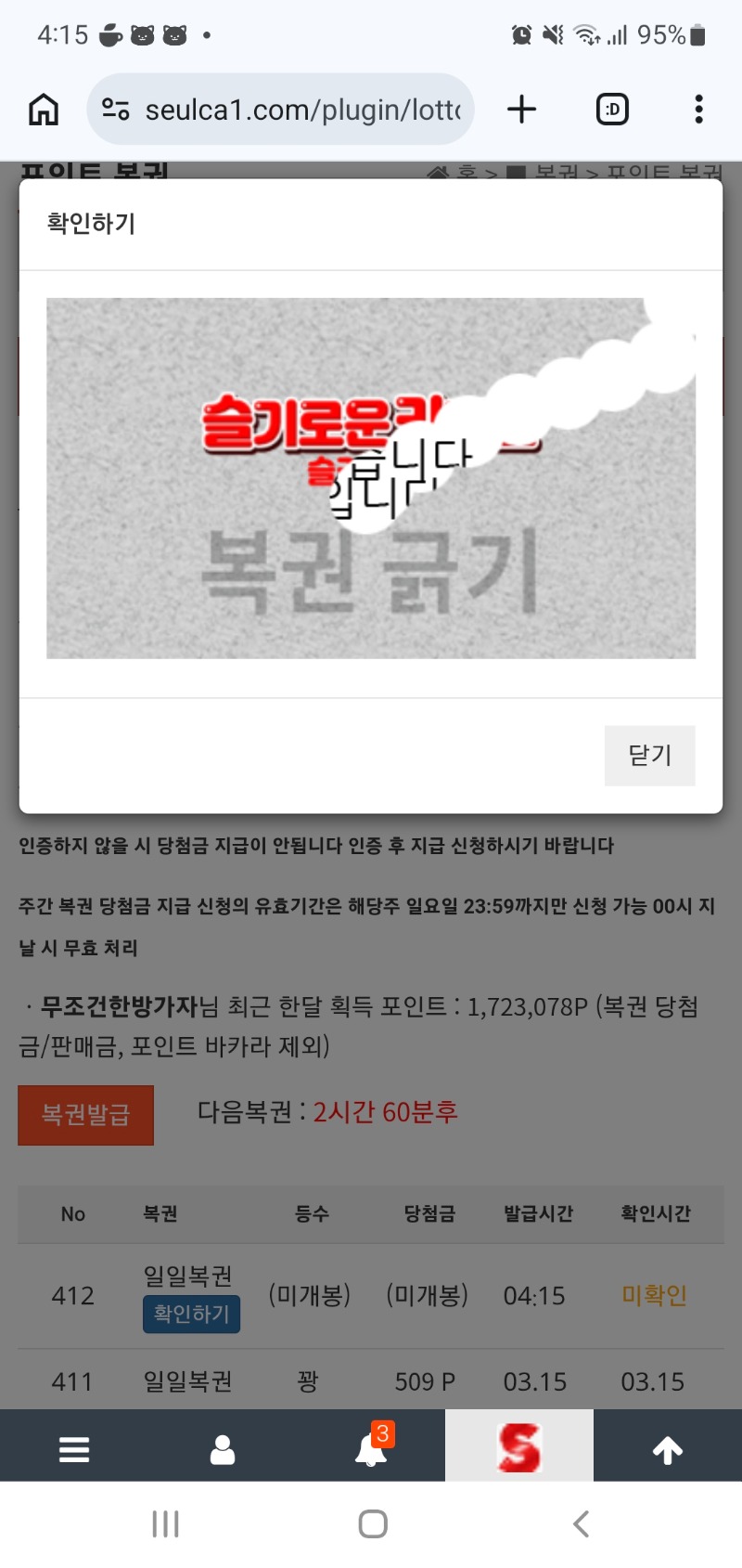한주첫복..은 무조건한방가자 2 0 0 03.16 04:16 *기프티콘 바코드 노출 주의* <- 4페이지 꽝도전중이여 0 0 https://seulca1.com/bbs/board.php?bo_table=free&wr_id=3686589 Author 0 0 Lv.8 무조건한방가자 8 3,322,391 (32%) 무조건한방가자님 보유 포인트 : P 10,825 03.16 금일 막복췍 +3 03.16 오후복췍 +4 03.16 100꽝고지가 코앞인데.. +2 03.16 오전복췍.. +2 03.16 한주첫복..은