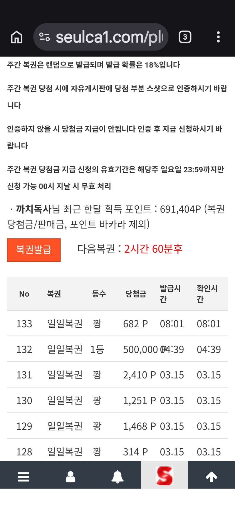 일복 1등 당첨샷 까치독사 6 0 0 08:24:12 *기프티콘 바코드 노출 주의* <- 스샷을 안 올려서 다시 올려봅니다. 0 0 https://seulca1.com/bbs/board.php?bo_table=free&wr_id=3686940 Author 1 0 Lv.6 까치독사 6 1,568,392 (56%) 까치독사님 보유 포인트 : P 606,149 +7 03.16 주복 10등 당첨이요 +6 03.16 일복 1등 당첨샷 +9 03.16 일복 1등 ㅅㅅㅅ +1 03.15 주의 마지막 일요일이네요 +1 03.15 비가 부슬부슬오는게 봄이 오나보네요