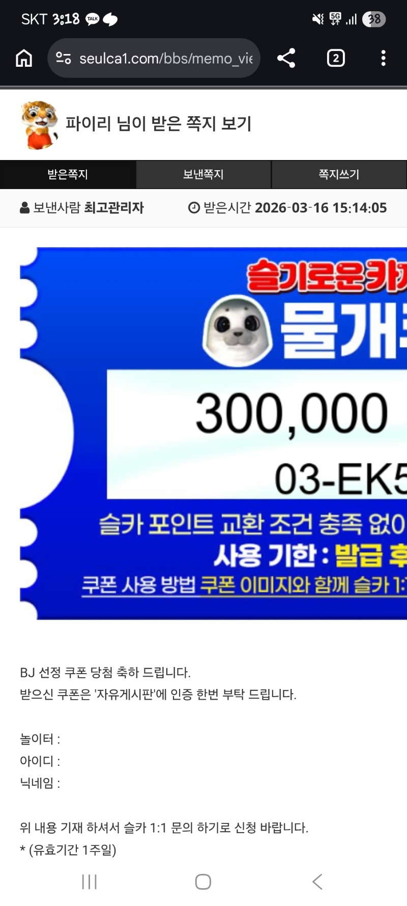 물개추겜포+비제쿱까지~ 파이리 12 0 0 15:18:58 *기프티콘 바코드 노출 주의* <- 0 0 https://seulca1.com/bbs/board.php?bo_table=free&wr_id=3687995 Author 2 1 Lv.12 파이리 12 17,652,622 (93%) 파이리님 보유 포인트 : P 5,498 03.16 이모~ +2 03.16 랑아 수익 축하한다!! +12 03.16 물개추겜포+비제쿱까지~ +6 03.16 활동왕포&비벼추겜 +12 03.16 주복당첨금 ㅋㅋ