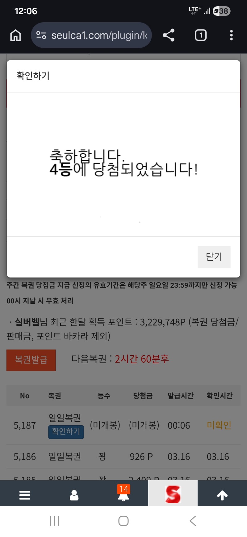 일복4등ㅎㅎ 실버벨 10 0 0 00:07:30 *기프티콘 바코드 노출 주의* <- 간만에 당첨이군~~~~ 0 0 https://seulca1.com/bbs/board.php?bo_table=free&wr_id=3690203 Author 8 6 Lv.19 실버벨 19 165,385,613 (0%) 실버벨님 보유 포인트 : P 4,200 +2 03.17 되는게 음네ㅋㅋ 03.17 출석하고 ~~ +10 03.17 일복4등ㅎㅎ +10 03.16 펭이 추겜당첨 +7 03.16 비버 추겜당첨 ~~