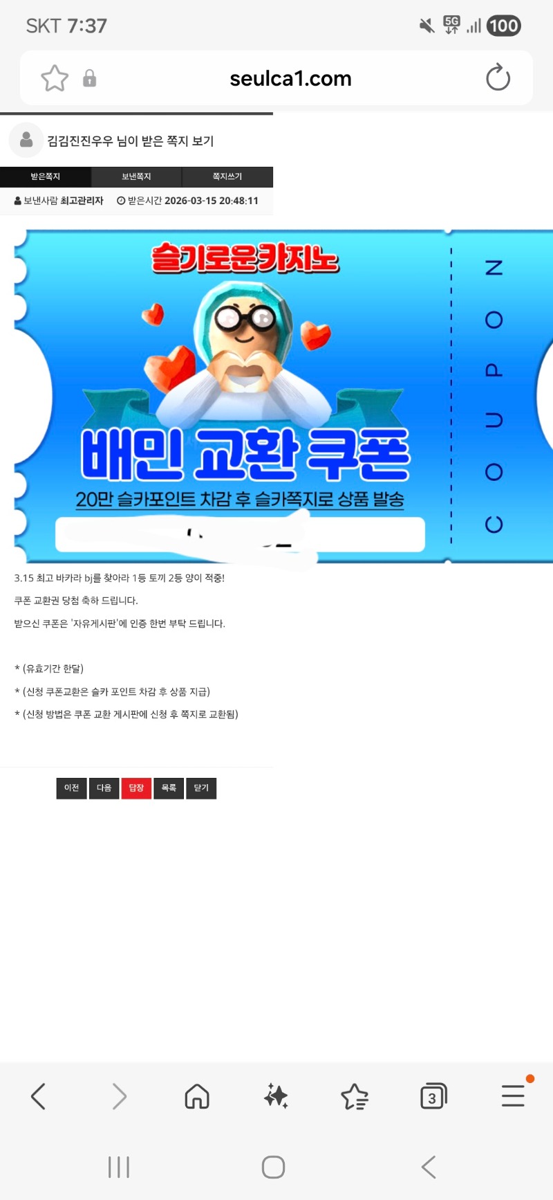 배민쿱 감사합니다 김김진진우우 4 0 0 07:39:25 *기프티콘 바코드 노출 주의* <- 이걸 지금 봤네 0 0 https://seulca1.com/bbs/board.php?bo_table=free&wr_id=3690876 Author 0 0 Lv.9 김김진진우우 9 4,872,731 (21%) 김김진진우우님 보유 포인트 : P 541,458 +4 03.17 배민쿱 감사합니다 +1 03.17 [비밀글] 배민 쿠폰 +1 03.05 [비밀글] 배민 쿠폰 +2 03.05 가족방 배민 감삼다 +2 02.27 굿모닝