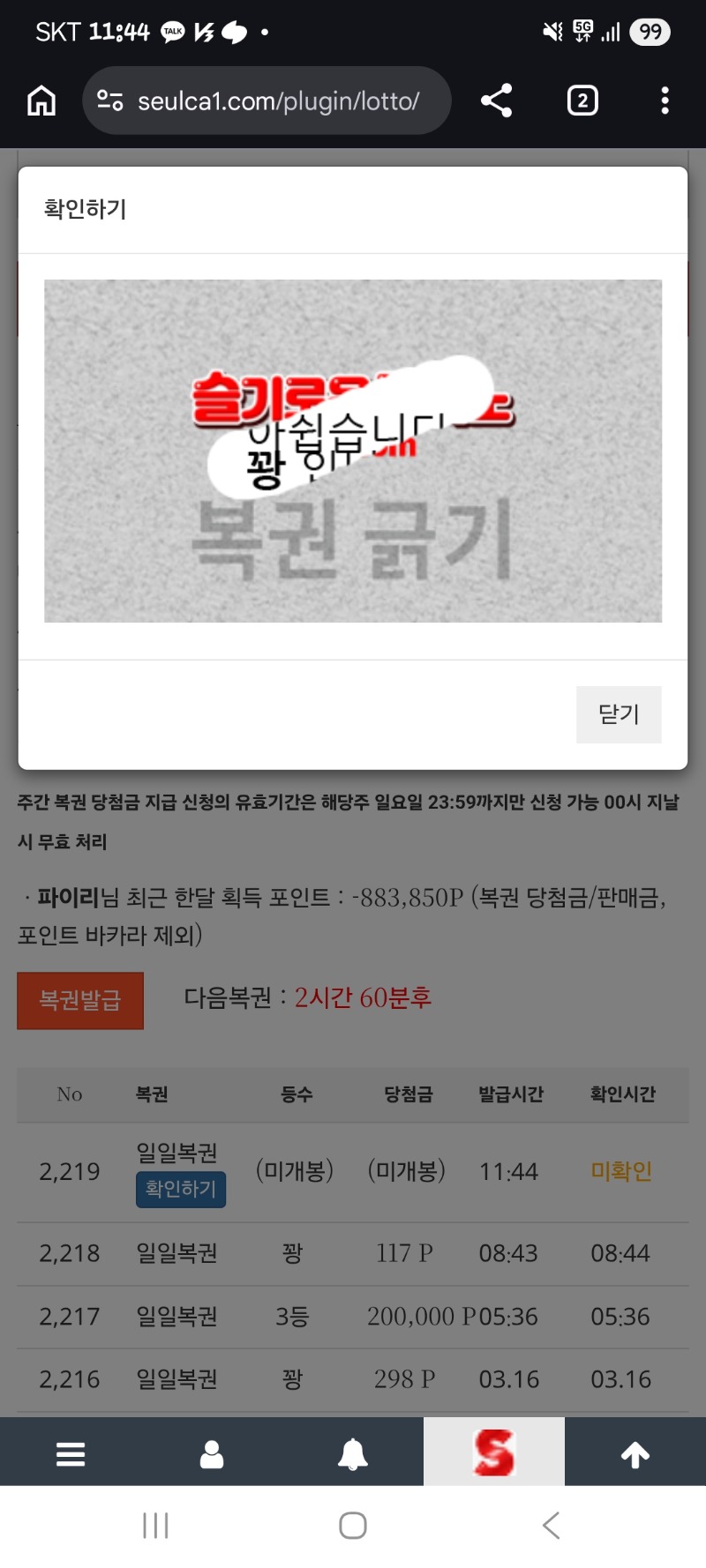 점심복권 꽝~ 파이리 6 0 0 11:44:52 *기프티콘 바코드 노출 주의* <- 0 0 https://seulca1.com/bbs/board.php?bo_table=free&wr_id=3691702 Author 2 1 Lv.12 파이리 12 17,686,538 (93%) 파이리님 보유 포인트 : P 5,659 +6 03.17 점심복권 꽝~ +5 03.17 미니형난 비버승 가부자 +4 03.17 선장 사자와 거짓말쟁이 랑이 ㅋㅋㅋㅋㅋ +10 03.17 이모 미션하러가기~ +6 03.17 진짜 슬카라 ㅋㅋㅋㅠ.ㅠ