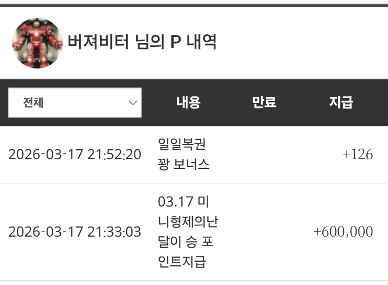 달이 승리 축하 비버 수고했으요 버져비터 4 0 0 21:54:44 *기프티콘 바코드 노출 주의* <- 포인트는 잘 쓰겠습니다 0 0 https://seulca1.com/bbs/board.php?bo_table=free&wr_id=3693639 Author 0 1 Lv.6 버져비터 6 1,756,264 (75%) 버져비터님 보유 포인트 : P 3,417,917 +10 03.17 미니형난 치킨 당첨 인증 +4 03.17 달이 승리 축하 비버 수고했으요 +6 03.17 먼저들 퇴근하세요 +4 03.17 업무로 인한 강제 단도중 +5 03.17 오후 첫 커담...
