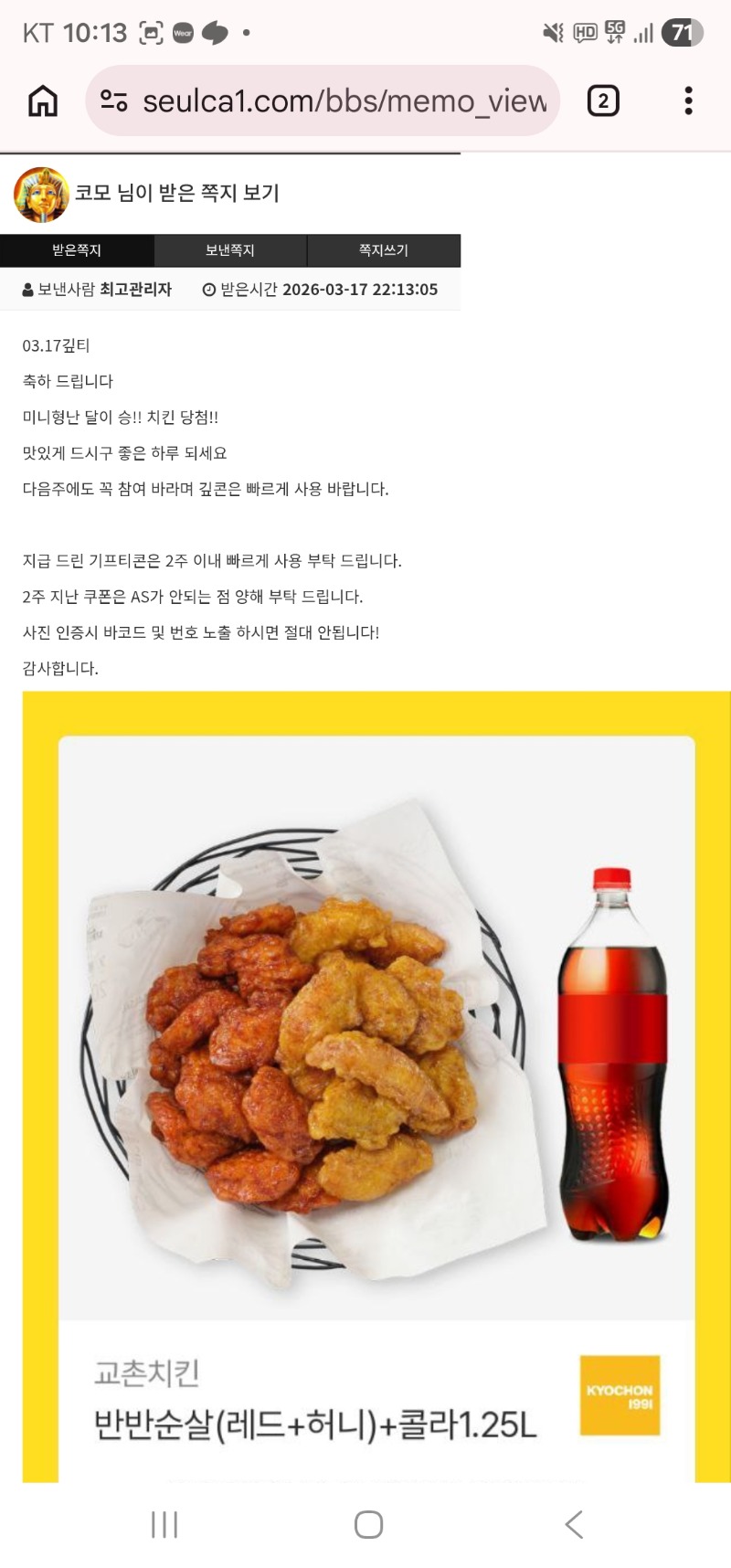 미형 오리당첨 치킨 감사합니다!! 코모 5 1 0 22:16:09 *기프티콘 바코드 노출 주의* <- 1 0 https://seulca1.com/bbs/board.php?bo_table=free&wr_id=3693832 Author 0 0 Lv.8 코모 8 3,324,139 (32%) 코모님 보유 포인트 : P 66,185 +5 03.17 미형 오리당첨 치킨 감사합니다!! +3 03.17 곧 100연꽝ㅋㅋ기 +2 03.17 미형 달이승! +1 03.17 맛저하세요~! +1 03.17 즐거운 퇴근길되세요~!