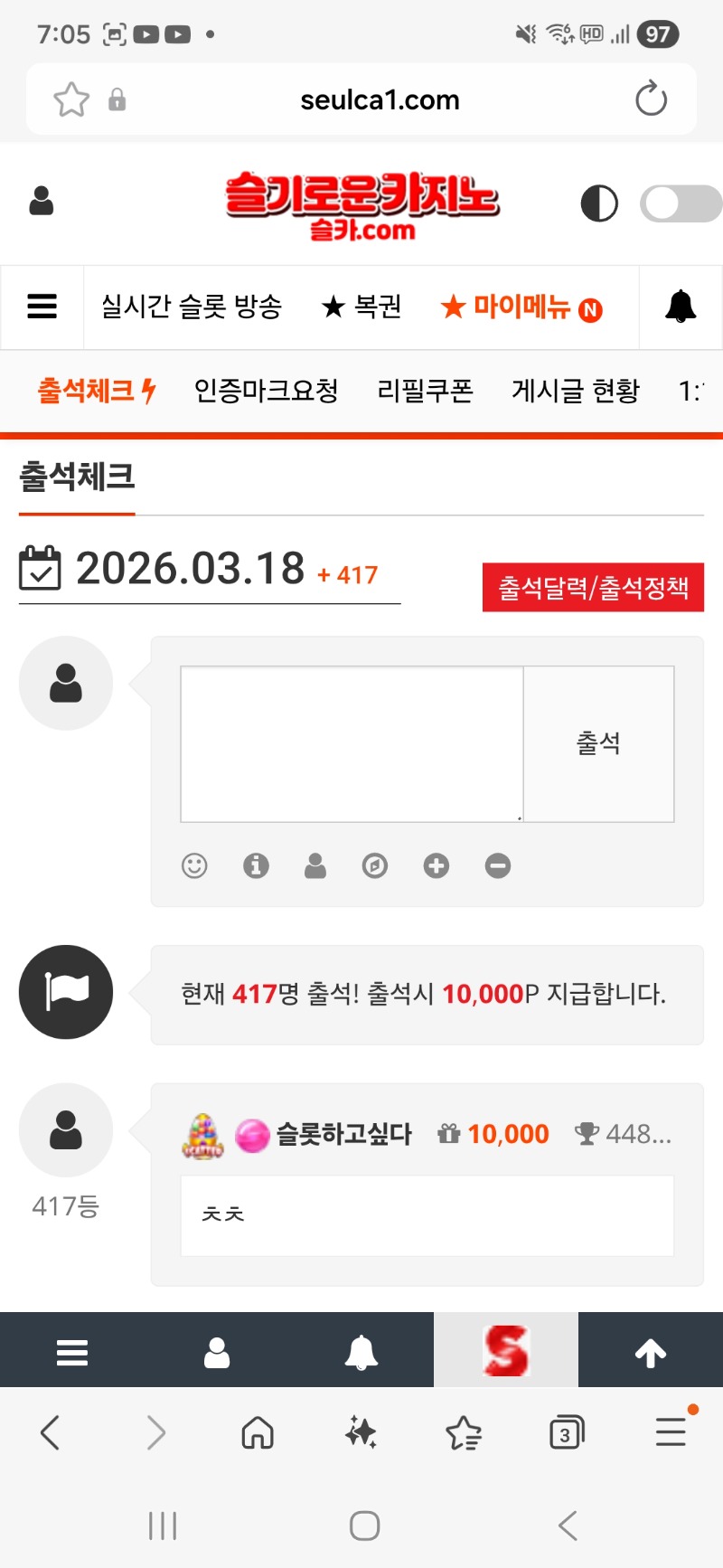 출석완료^^ 슬롯하고싶다 0 0 0 07:22:09 *기프티콘 바코드 노출 주의* <- 무조건 만근이죠 0 0 https://seulca1.com/bbs/board.php?bo_table=free&wr_id=3694921 Author 5 1 Lv.16 슬롯하고싶다 16 55,843,389 (29%) 슬롯하고싶다님 보유 포인트 : P 1,482,846 03.18 아침은 토스트로시작^^ +3 03.18 새벽당첨자분들이 많이나오내요 03.18 출석완료^^ +8 03.18 모닝 카라 패 마무리요 +7 03.18 모닝카라 1패