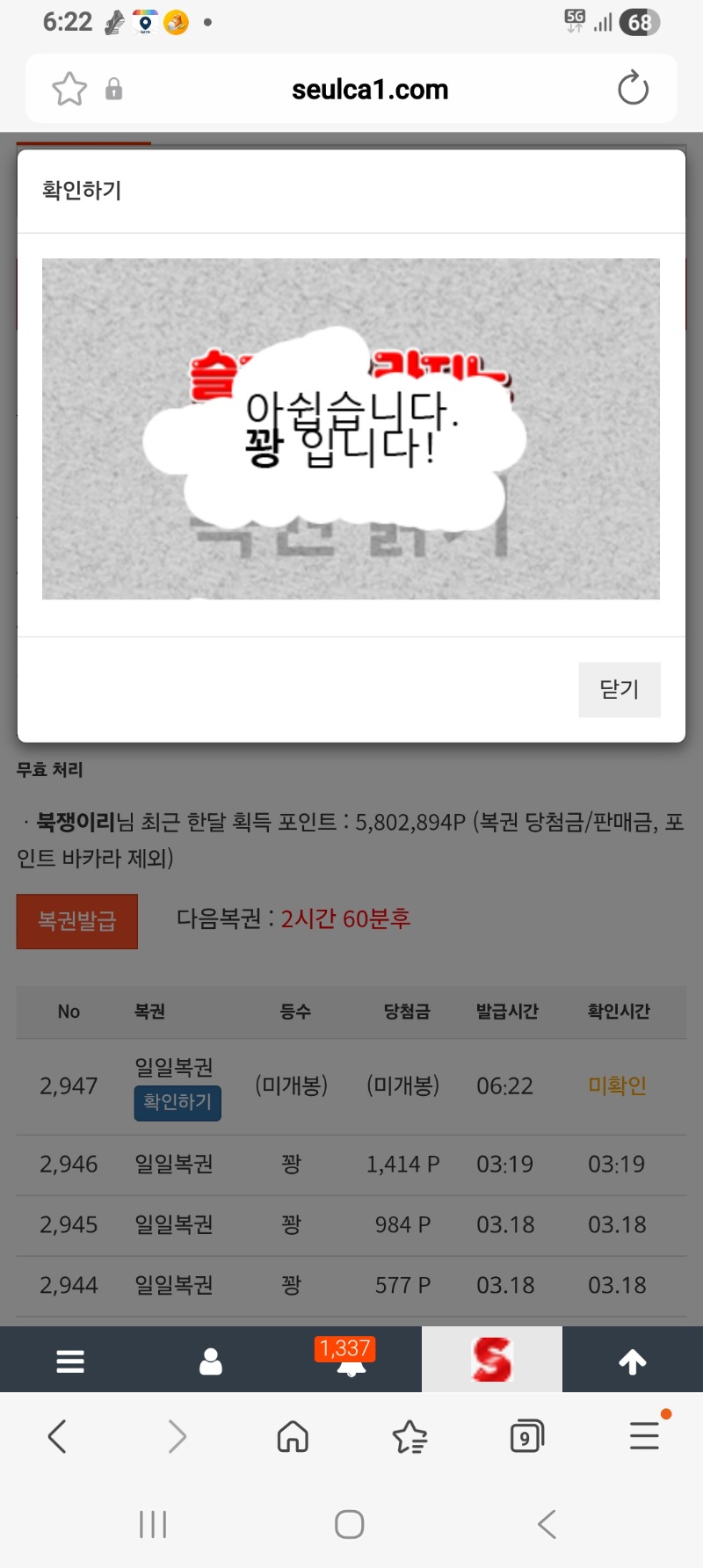 모닝복권 북쟁이리 4 1 0 06:23:15 *기프티콘 바코드 노출 주의* <- 꽝이네요. 1 0 https://seulca1.com/bbs/board.php?bo_table=free&wr_id=3699423 Author 4 3 Lv.14 북쟁이리 14 29,151,771 (87%) 북쟁이리님 보유 포인트 : P 13,625 +1 03.19 출첵 +4 03.19 모닝복권 +1 03.19 굿모닝입니다 +3 03.19 이모소환 +21 03.19 로얄슈천 816배