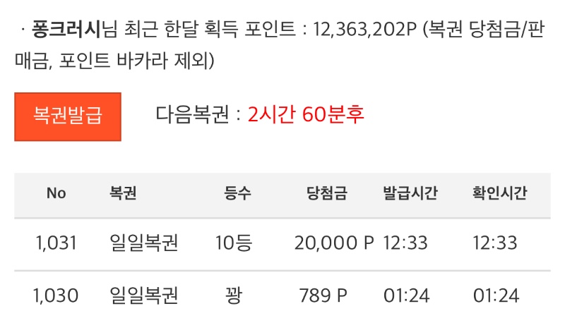 아놔~.~일복10등당촘!! 퐁크러시 7 0 0 12:34:51 *기프티콘 바코드 노출 주의* <- 2만포가어디냐ㅇ.ㅇ 0 0 https://seulca1.com/bbs/board.php?bo_table=free&wr_id=3700743 Author 1 0 Lv.12 퐁크러시 12 14,260,511 (25%) 퐁크러시님 보유 포인트 : P 36,367 +7 03.19 아놔~.~일복10등당촘!! +5 03.18 최배비1등적중!! +12 03.18 비오는날은 파전이쥬 ♡ +36 03.16 300만포교성공 수익환~ +31 03.16 투박스고대로가!!!