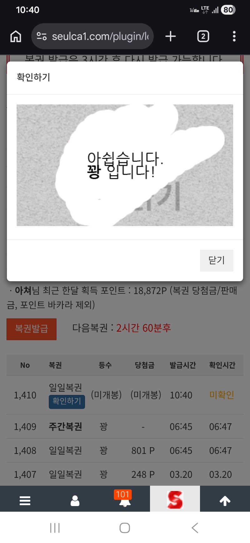 일복 꽝 .. 아쳐 1 0 0 10:40:56 *기프티콘 바코드 노출 주의* <- 0 0 https://seulca1.com/bbs/board.php?bo_table=free&wr_id=3707533 Author 1 1 Lv.9 아쳐 9 7,892,176 (97%) 아쳐님 보유 포인트 : P 0 03.21 [비밀글] 주복6등 +1 03.21 일복 꽝 .. +3 03.21 쌍복이 ..과연.. +2 03.21 출책 +2 03.20 일복 꽝꽝꽝..
