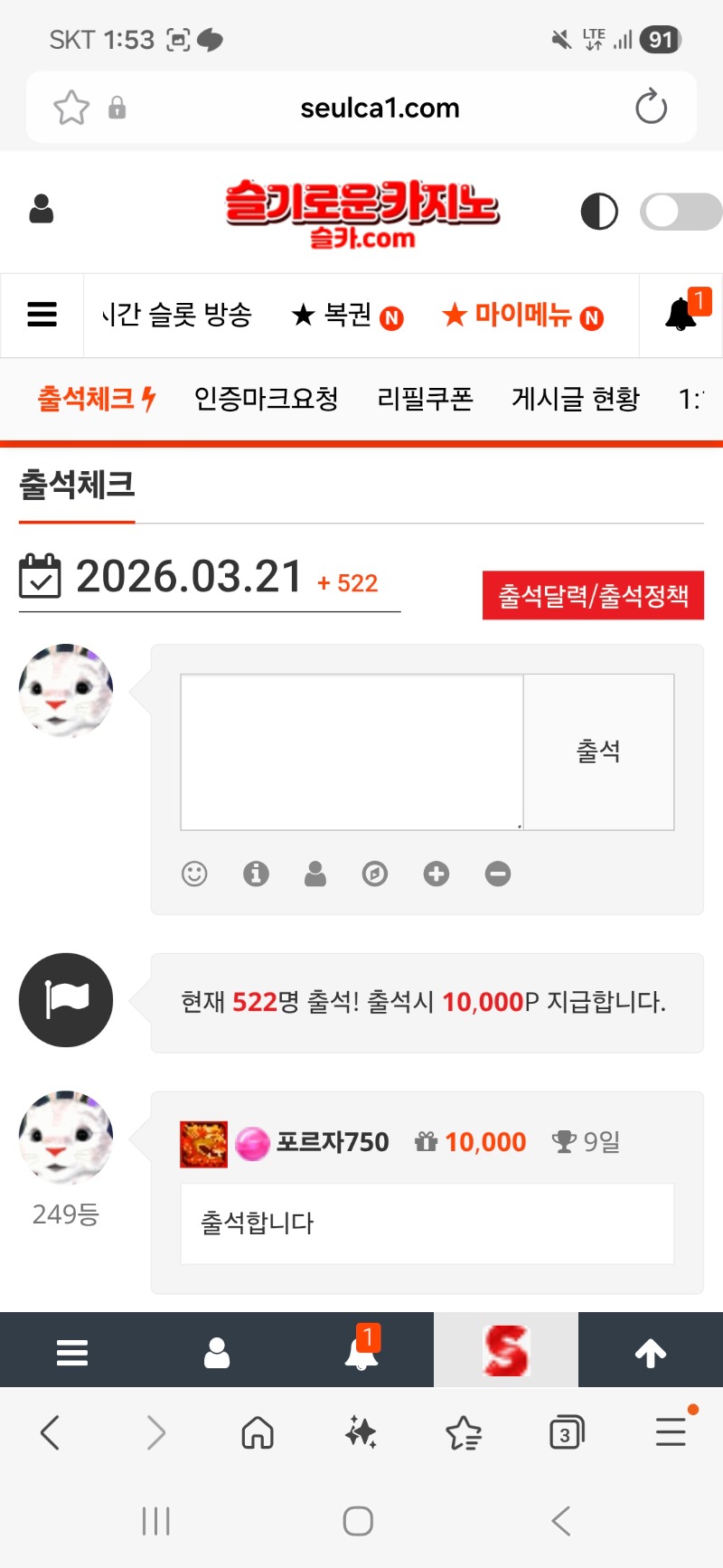 다시 출첵을 ㅜㅜ 포르자750 1 0 0 13:55:29 *기프티콘 바코드 노출 주의* <- 0 0 https://seulca1.com/bbs/board.php?bo_table=free&wr_id=3707974 Author 7 1 Lv.14 포르자750 14 28,922,104 (84%) 포르자750님 보유 포인트 : P 0 03.21 양이 왓으예! +1 03.21 주복이 안보임 +1 03.21 다시 출첵을 ㅜㅜ +1 03.21 왠일이래... +7 03.21 문바카라