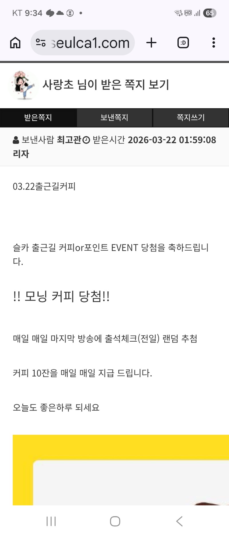 출근길 커피 감사합니다 사랑초 2 0 0 09:35:25 *기프티콘 바코드 노출 주의* <- 0 0 https://seulca1.com/bbs/board.php?bo_table=free&wr_id=3710578 Author 2 1 Lv.13 사랑초 13 20,707,490 (54%) 사랑초님 보유 포인트 : P 79,486 +2 03.22 출근길 커피 감사합니다 +1 03.22 출첵완료 +1 03.21 주인장 리필주시오 +1 03.21 오늘은 돌발 있을려나.. +2 03.21 젠장 깡치기 실패