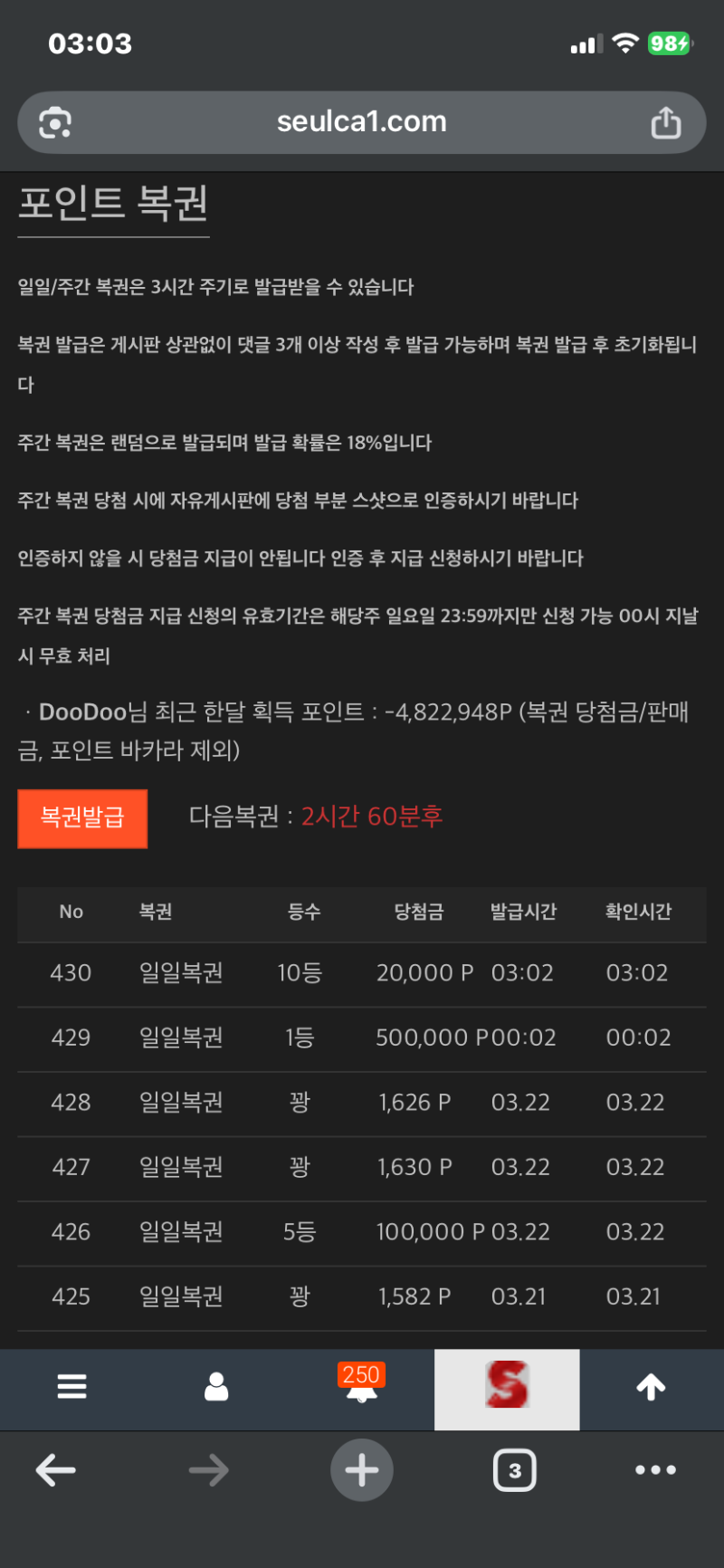 일복 10등 DooDoo 1 0 0 03:04:10 *기프티콘 바코드 노출 주의* <- 0 0 https://seulca1.com/bbs/board.php?bo_table=free&wr_id=3713897 Author 0 0 Lv.9 DooDoo 9 5,210,922 (30%) DooDoo님 보유 포인트 : P 537,078 +1 03.23 일복 10등 +3 03.23 첫 일복이 1등 당첨 +1 03.22 [비밀글] 포인트교환 신청 +10 03.22 일복5등 당첨 +33 03.22 바카라 승
