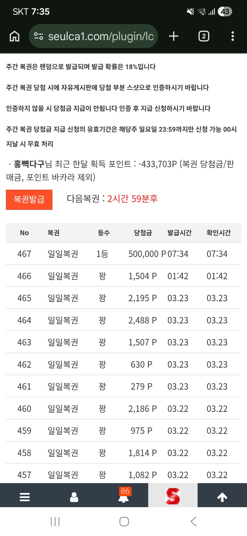 모닝복권 일복1등!! 홍뼉다구 5 0 0 07:36:59 *기프티콘 바코드 노출 주의* <- 드디어 오는구나~!!!! 0 0 https://seulca1.com/bbs/board.php?bo_table=free&wr_id=3717393 Author 0 0 Lv.9 홍뼉다구 9 4,393,786 (9%) 홍뼉다구님 보유 포인트 : P 692,751 +4 03.24 멀린 4220 +6 03.24 뱀피 389배 +3 03.24 토라메 231배 +2 03.24 공천 120배 +1 03.24 올천 250배