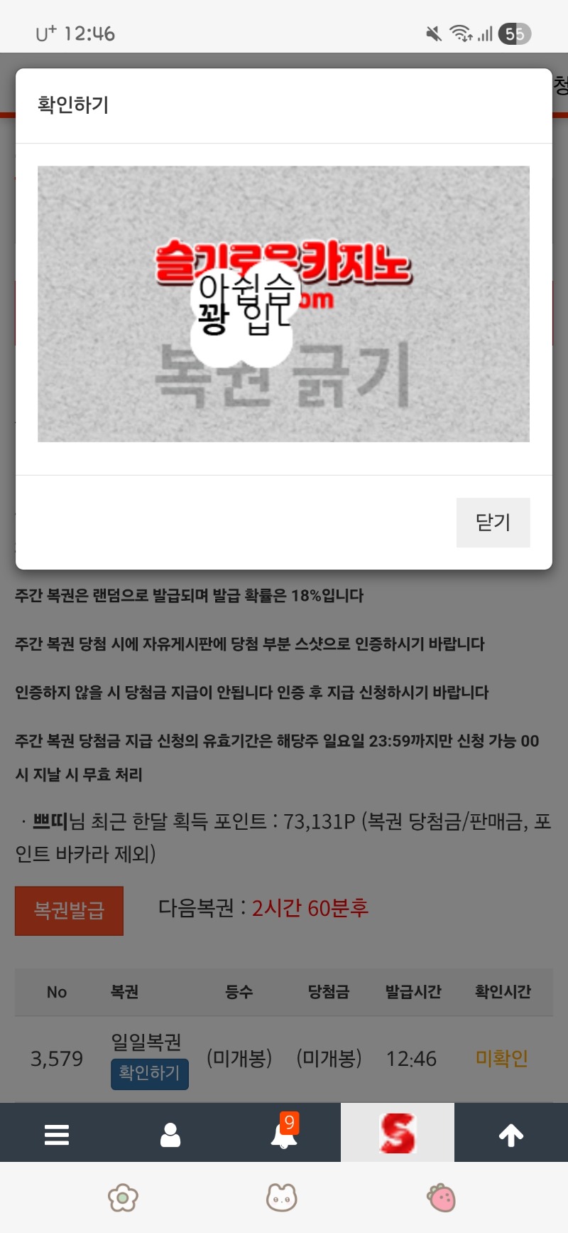 점심 복권 꽝 쁘띠 1 0 0 12:46:45 *기프티콘 바코드 노출 주의* <- 0 0 https://seulca1.com/bbs/board.php?bo_table=free&wr_id=3718112 Author 16 4 Lv.17 쁘띠 17 78,546,660 (28%) 쁘띠님 보유 포인트 : P 1,806,571 +1 03.24 점심 복권 꽝 +2 03.24 새벽 복권 꽝 03.24 첫복권 꽝 +4 03.24 또 쌍복~~!! +2 03.24 출첵