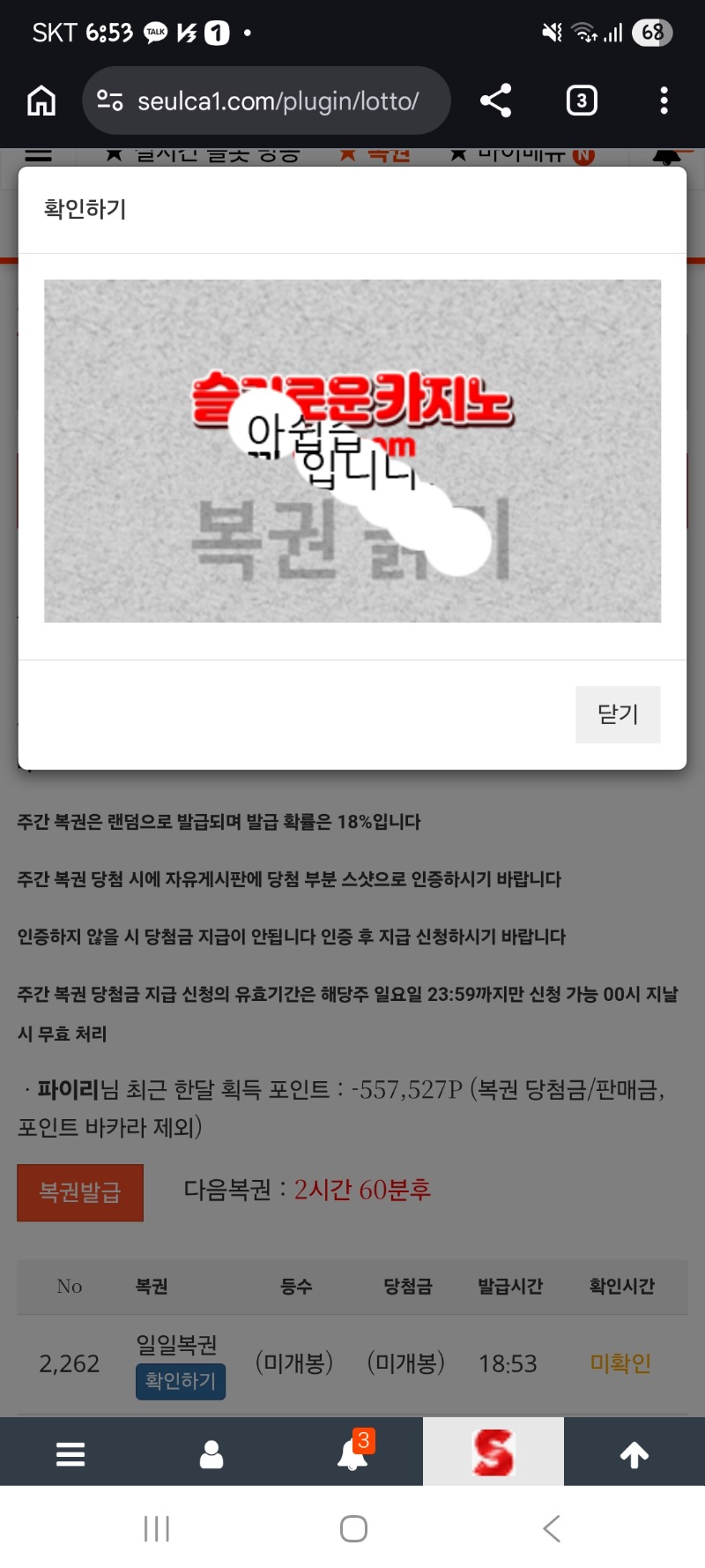 오늘 마지막복권 꽝 파이리 0 0 0 18:54:06 *기프티콘 바코드 노출 주의* <- 0 0 https://seulca1.com/bbs/board.php?bo_table=free&wr_id=3718921 Author 2 1 Lv.13 파이리 13 18,123,827 (2%) 파이리님 보유 포인트 : P 4,280 +4 03.24 아어 내 포인트 ㅠㅠ 03.24 미니형난 할시간이 다가오네요 +4 03.24 이모는 찾아야겠지...힘껏 외쳐봅니다!! 03.24 오늘 마지막복권 꽝 +4 03.24 뱅하나더 나오고 꺽여라!!