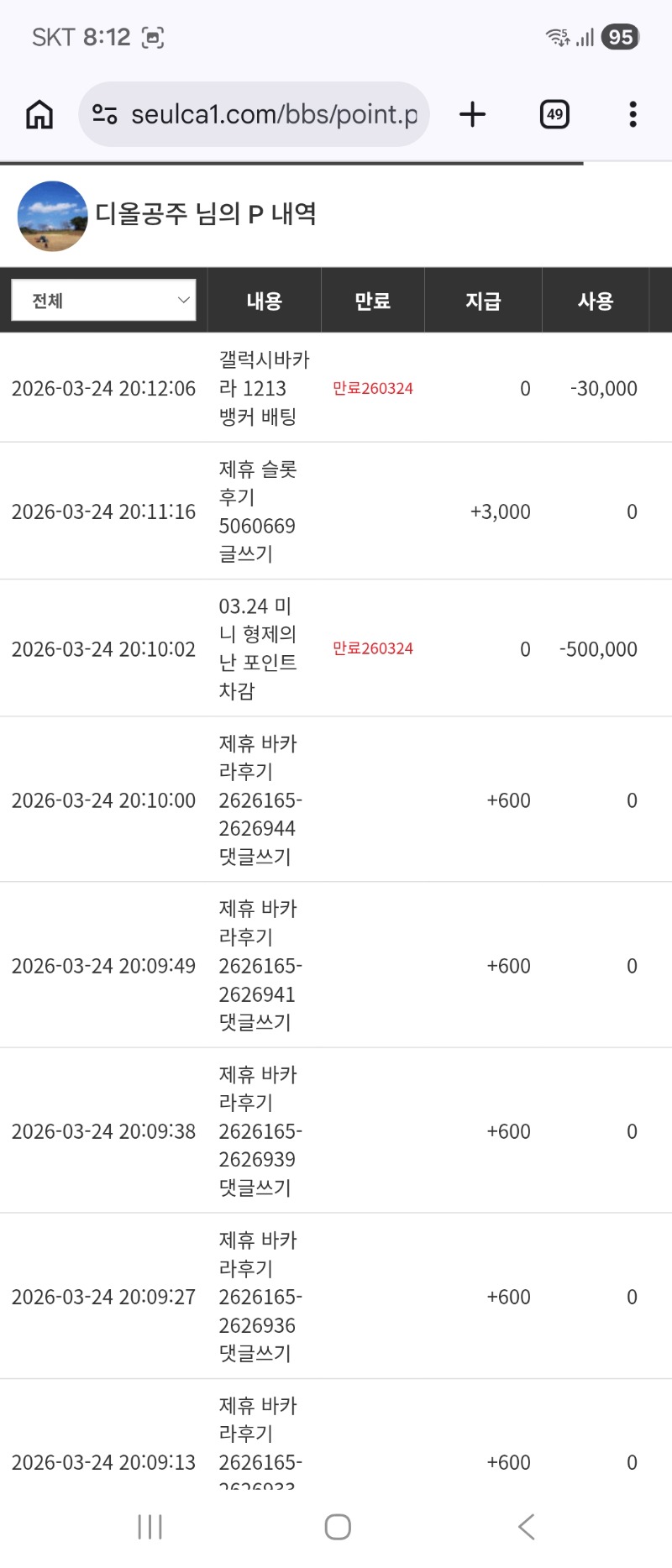 미니형난 포인트 차감 디올공주 6 0 0 20:12:51 *기프티콘 바코드 노출 주의* <- 0 0 https://seulca1.com/bbs/board.php?bo_table=free&wr_id=3719216 Author 23 16 Lv.19 디올공주 19 205,805,333 (0%) 디올공주님 보유 포인트 : P 6,208,807 +12 03.24 미니형난 적중 포인트 ㅅㅅ +4 03.24 미니형난 수고하셨습니다 +9 03.24 트로피카나 193배*4200냥 +6 03.24 미니형난 포인트 차감 03.24 오2 5178배