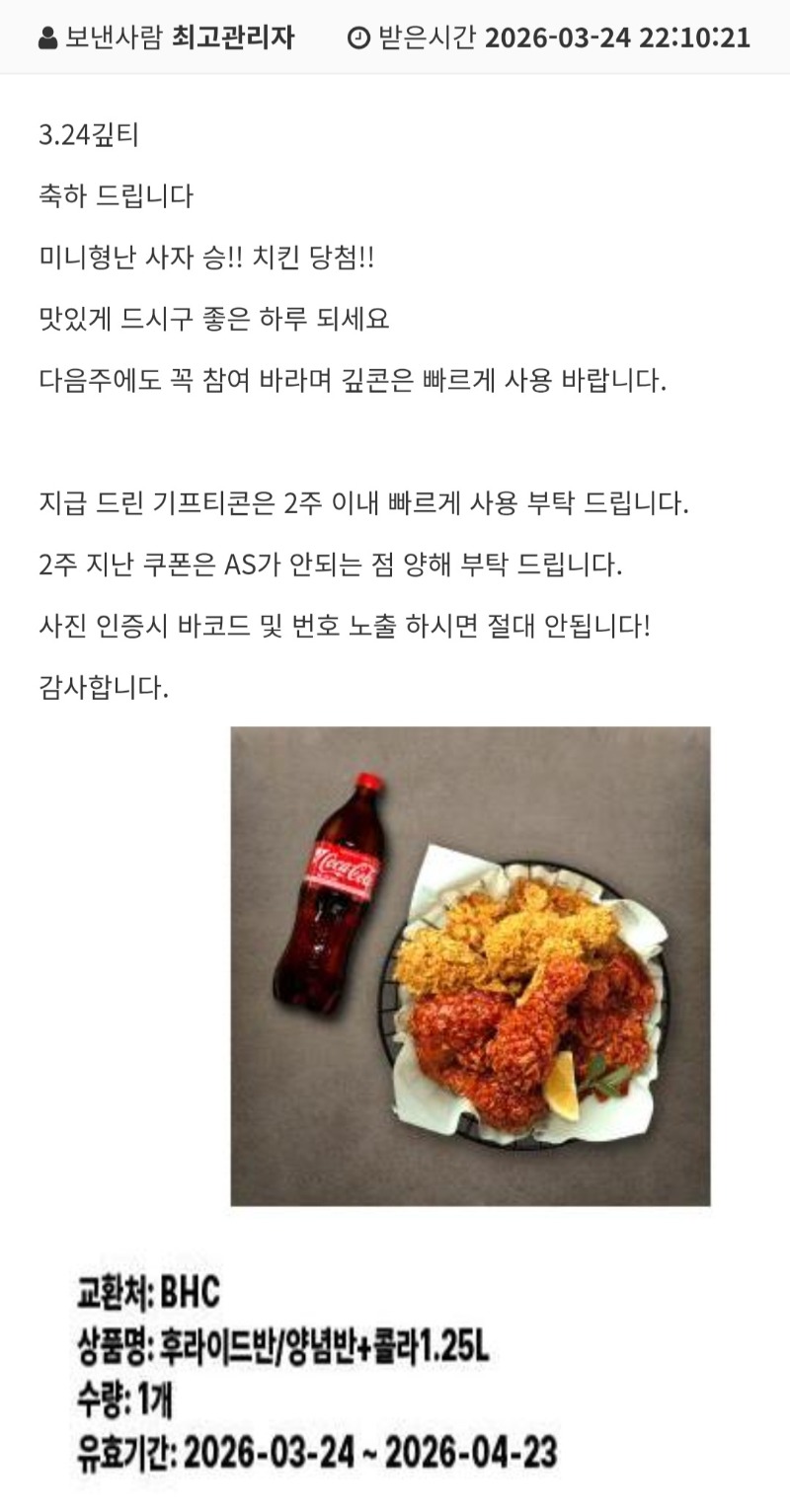 나이스 치킨당첨!!감사합니다!! 코모 3 0 0 22:11:42 *기프티콘 바코드 노출 주의* <- 0 0 https://seulca1.com/bbs/board.php?bo_table=free&wr_id=3719505 Author 0 0 Lv.8 코모 8 3,740,042 (74%) 코모님 보유 포인트 : P 2,400 +3 03.24 나이스 치킨당첨!!감사합니다!! +1 03.24 미형 화이팅!!! +1 03.24 날씨는 좋고 나른하네요~ +3 03.24 맛점하세요~ +1 03.24 좋은아침입니다ㅎ