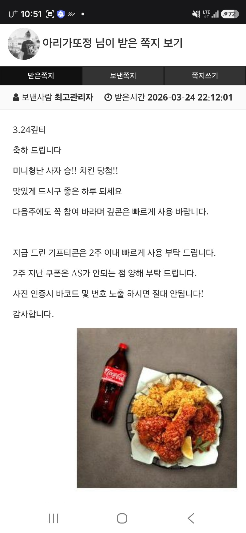 미니형난사자치킨 아리가또정 1 0 0 03.24 22:52 *기프티콘 바코드 노출 주의* <- 고마워사자야 고생햇어♡♡ 0 0 https://seulca1.com/bbs/board.php?bo_table=free&wr_id=3719630 Author 4 2 Lv.12 아리가또정 12 17,649,739 (92%) 아리가또정님 보유 포인트 : P 14,801,872 +1 03.24 미니형난사자치킨 +5 03.23 최바비 배민 +1 03.22 [비밀글] 배민교환합니다 +5 03.19 남자는역배 +2 03.17 축구가즈아