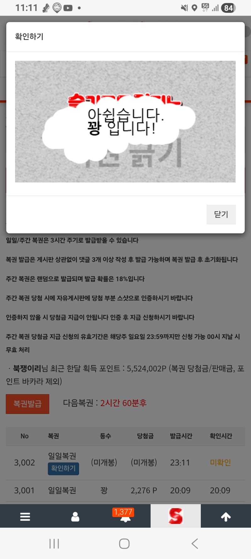 오늘의 마지막 복권 북쟁이리 1 0 0 03.24 23:12 *기프티콘 바코드 노출 주의* <- 역시 꽝. 0 0 https://seulca1.com/bbs/board.php?bo_table=free&wr_id=3719661 Author 4 3 Lv.14 북쟁이리 14 29,553,433 (93%) 북쟁이리님 보유 포인트 : P 27,916 +1 03.24 오늘의 마지막 복권 +10 03.24 오라메 365배*400 +22 03.24 로얄슈천 5018배 03.24 사자 축하하고 펭이 고생했다. +1 03.24 미.형 포인트 남부 완료.