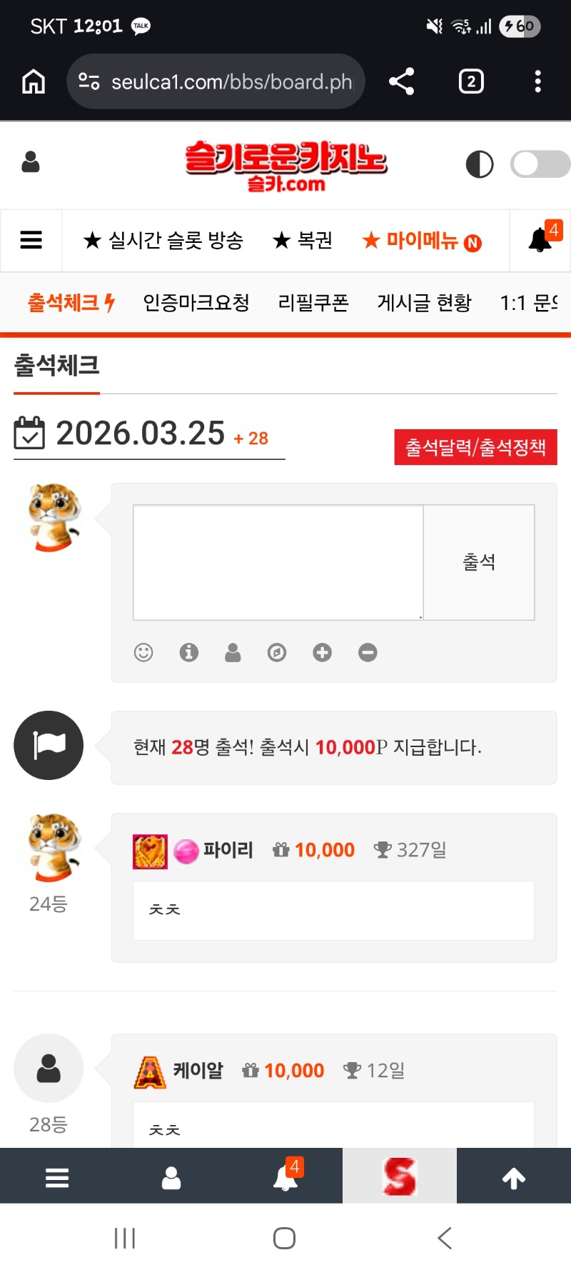 출첵하고! 파이리 0 0 0 00:01:52 *기프티콘 바코드 노출 주의* <- 0 0 https://seulca1.com/bbs/board.php?bo_table=free&wr_id=3719720 Author 2 1 Lv.13 파이리 13 18,143,133 (2%) 파이리님 보유 포인트 : P 23,586 03.25 출첵하고! 03.24 사자 승 축하해!!! 펭아 고생했어~~ +6 03.24 아어 내 포인트 ㅠㅠ 03.24 미니형난 할시간이 다가오네요 +4 03.24 이모는 찾아야겠지...힘껏 외쳐봅니다!!