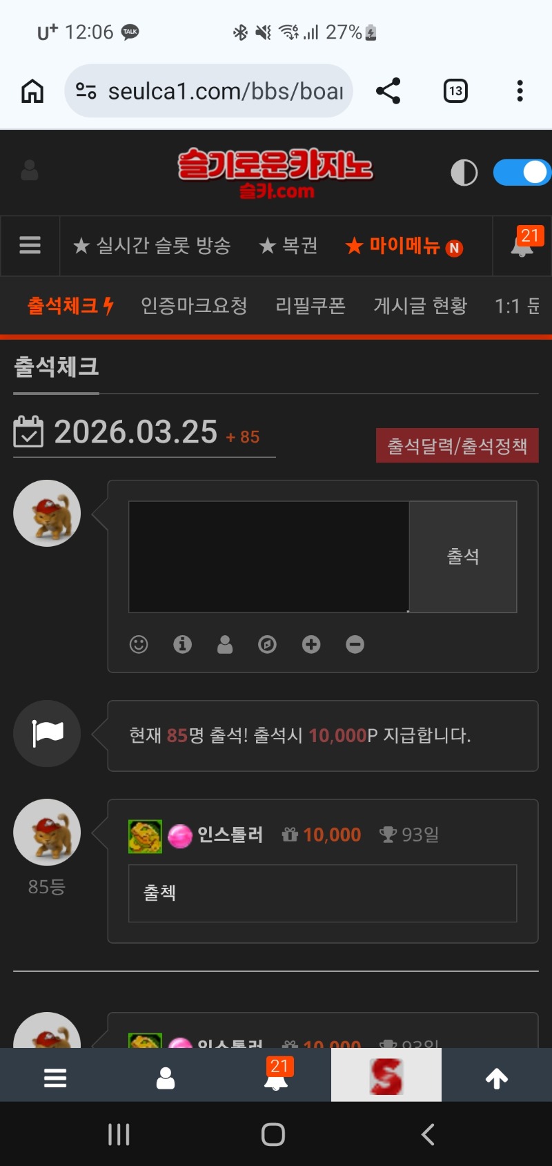 오늘도출첵 인스톨러 0 0 0 00:07:27 *기프티콘 바코드 노출 주의* <- 이제만근 얼마안남았네요 다들만근갓짜 0 0 https://seulca1.com/bbs/board.php?bo_table=free&wr_id=3719752 Author 1 0 Lv.12 인스톨러 12 13,089,298 (1%) 인스톨러님 보유 포인트 : P 511,114 +1 03.25 룰렛 차리 지든지 이게뭐냐7천원ㅡㅡ +1 03.25 룰렛 2칸만옆으로가면대는데...패 +2 03.25 룰렛 소액패 +5 03.25 오리본 2092배 +6 03.25 오리본138배 바닥진입2400원
