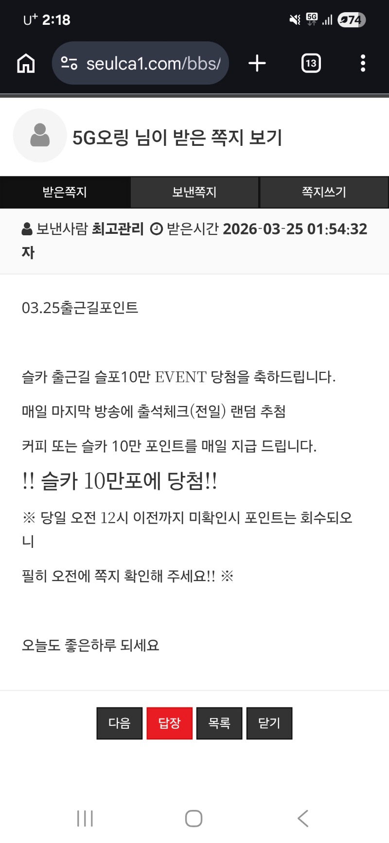 출근길포인트! 5G오링 3 0 0 02:19:17 *기프티콘 바코드 노출 주의* <- 감사합니다 0 0 https://seulca1.com/bbs/board.php?bo_table=free&wr_id=3719891 Author 2 0 Lv.13 5G오링 13 20,479,737 (49%) 5G오링님 보유 포인트 : P 770,167 +1 03.25 새벽복권꽝 +3 03.25 출근길포인트! +5 03.25 모노폴리 진입몇번더있지만 -150ㅠㅠ +5 03.25 모노폴리 3롤 먹은거만 +3 03.25 모노폴리 3롤
