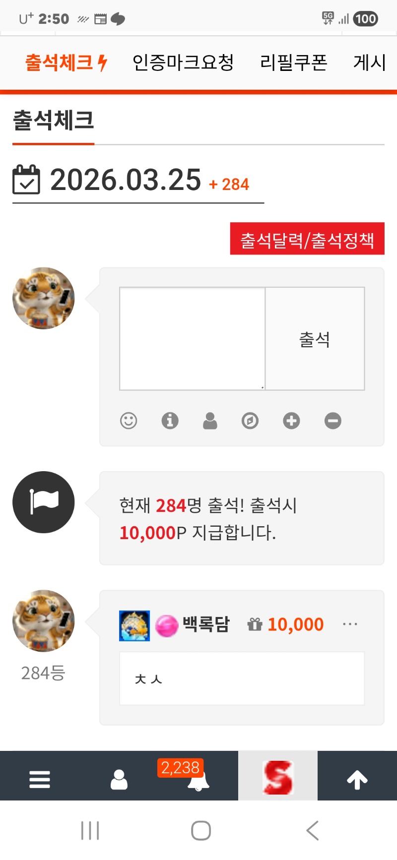 출석합니다 백록담 1 0 0 02:51:32 *기프티콘 바코드 노출 주의* <- 0 0 https://seulca1.com/bbs/board.php?bo_table=free&wr_id=3719926 Author 0 0 Lv.11 백록담 11 12,572,437 (85%) 백록담님 보유 포인트 : P 79,168 +1 03.25 출석합니다 +2 03.24 다시반복되는 리필인생..하~~ +2 03.24 굿모닝입니다 +17 03.24 타이말고 이기는걸주라.ㅋ +19 03.24 9대0 이 머냐..