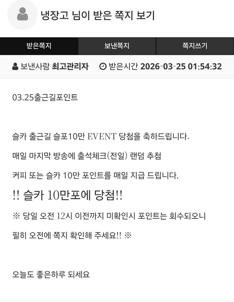 저에게도 이런일이 냉장고 3 0 0 04:24:01 *기프티콘 바코드 노출 주의* <- 0 0 https://seulca1.com/bbs/board.php?bo_table=free&wr_id=3719999 Author 1 0 Lv.10 냉장고 10 8,027,944 (1%) 냉장고님 보유 포인트 : P 381,307 +3 03.25 저에게도 이런일이 +4 03.24 드뎌 10렙 입니다 03.23 퇴근합니다 03.23 수고하셨습니다 03.23 건승하세요