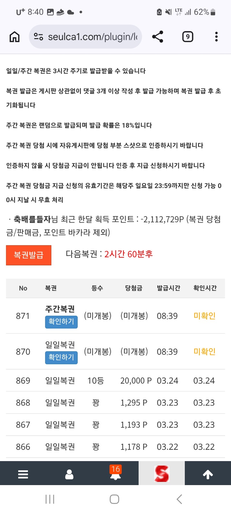 모닝 쌍복출연 축배를들자 4 1 0 09:01:18 *기프티콘 바코드 노출 주의* <- 제발 주복 1등 한번만 주세요 1 0 https://seulca1.com/bbs/board.php?bo_table=free&wr_id=3720502 Author 3 0 Lv.12 축배를들자 12 16,841,041 (76%) 축배를들자님 보유 포인트 : P 10,686 +6 03.25 주복은 꽝 대신일복4등 ㅅㅅㅅ +1 03.25 출근길 +4 03.25 모닝 쌍복출연 +1 03.25 굿모닝입니다 03.25 출석합니다