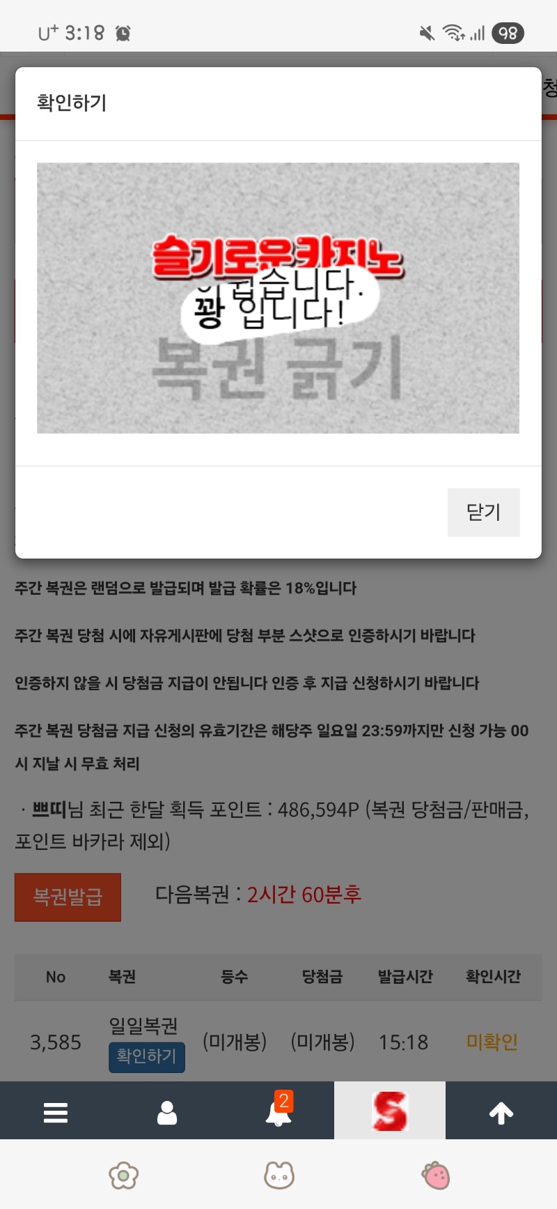 점심 복권 꽝 쁘띠 2 0 0 15:19:12 *기프티콘 바코드 노출 주의* <- 0 0 https://seulca1.com/bbs/board.php?bo_table=free&wr_id=3721344 Author 16 4 Lv.17 쁘띠 17 78,596,419 (28%) 쁘띠님 보유 포인트 : P 2,067,973 +2 03.25 점심 복권 꽝 03.25 모닝 복권 꽝 03.25 아침 쌍복~~!!! +12 03.25 미형 사자승~!!!나아따 03.25 첫복권 꽝