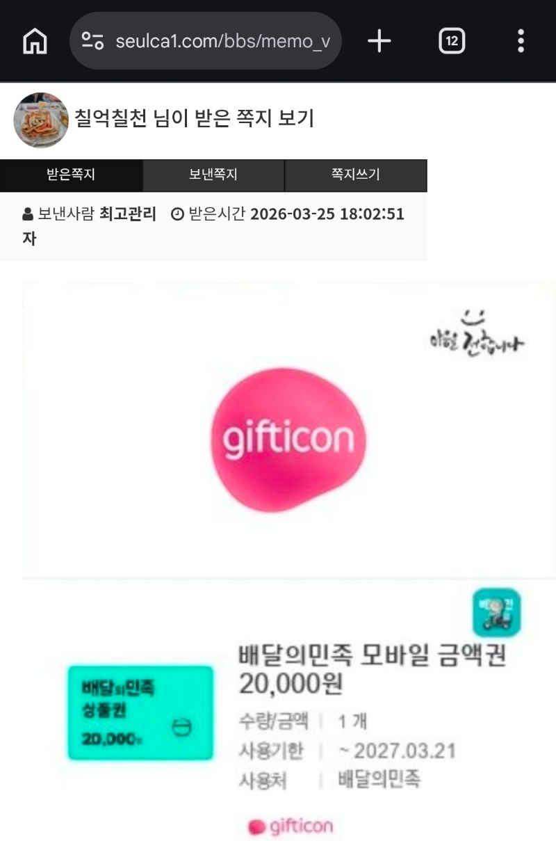 배쿱 교환! 칠억칠천 1 0 0 18:07:39 *기프티콘 바코드 노출 주의* <- 0 0 https://seulca1.com/bbs/board.php?bo_table=free&wr_id=3721640 Author 9 2 Lv.12 칠억칠천 12 16,680,033 (73%) 칠억칠천님 보유 포인트 : P 2,104,765 +1 03.25 배쿱 교환! +1 03.25 펭아 쌩유 +1 03.25 [비밀글] 배민교환 +4 03.25 펭추겜 당첨 +15 03.25 4대1. 플 승