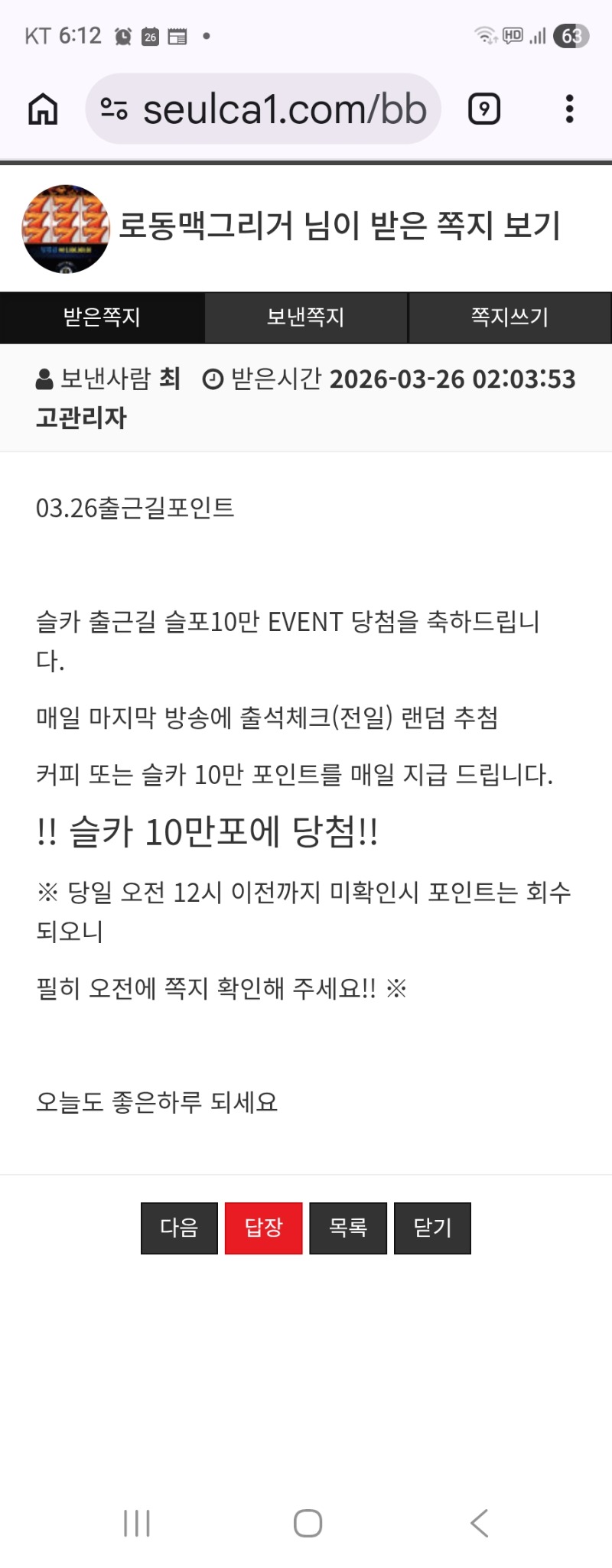 출근길 슬포 ㄱㅅㄱㅅ 로동맥그리거 2 0 0 06:13:54 *기프티콘 바코드 노출 주의* <- 0 0 https://seulca1.com/bbs/board.php?bo_table=free&wr_id=3722732 Author 6 1 Lv.13 로동맥그리거 13 18,121,579 (2%) 로동맥그리거님 보유 포인트 : P 1,448,090 +2 03.26 출근길 슬포 ㄱㅅㄱㅅ +7 03.25 시안데이 수익마감 ㄱㅅㄱㅅ +23 03.25 사무3. 479배 +21 03.25 사이언매니아 866 +6 03.25 모닝 복권 당첨! 10등 ㅋ