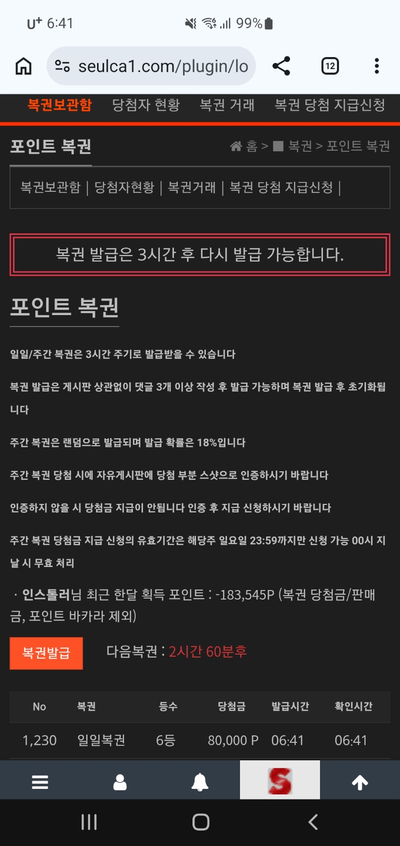 모닝복권 일복6등 인스톨러 1 0 0 06:42:39 *기프티콘 바코드 노출 주의* <- 0 0 https://seulca1.com/bbs/board.php?bo_table=free&wr_id=3722769 Author 1 0 Lv.12 인스톨러 12 13,113,295 (2%) 인스톨러님 보유 포인트 : P 1,136,638 +1 03.26 모닝복권 일복6등 03.25 간만에쌍복 그냥가네요 +1 03.25 일복1ㅇ등 좋은아침입니다 +17 03.25 룰렛 차리 지든지 이게뭐냐7천원ㅡㅡ +18 03.25 룰렛 2칸만옆으로가면대는데...패