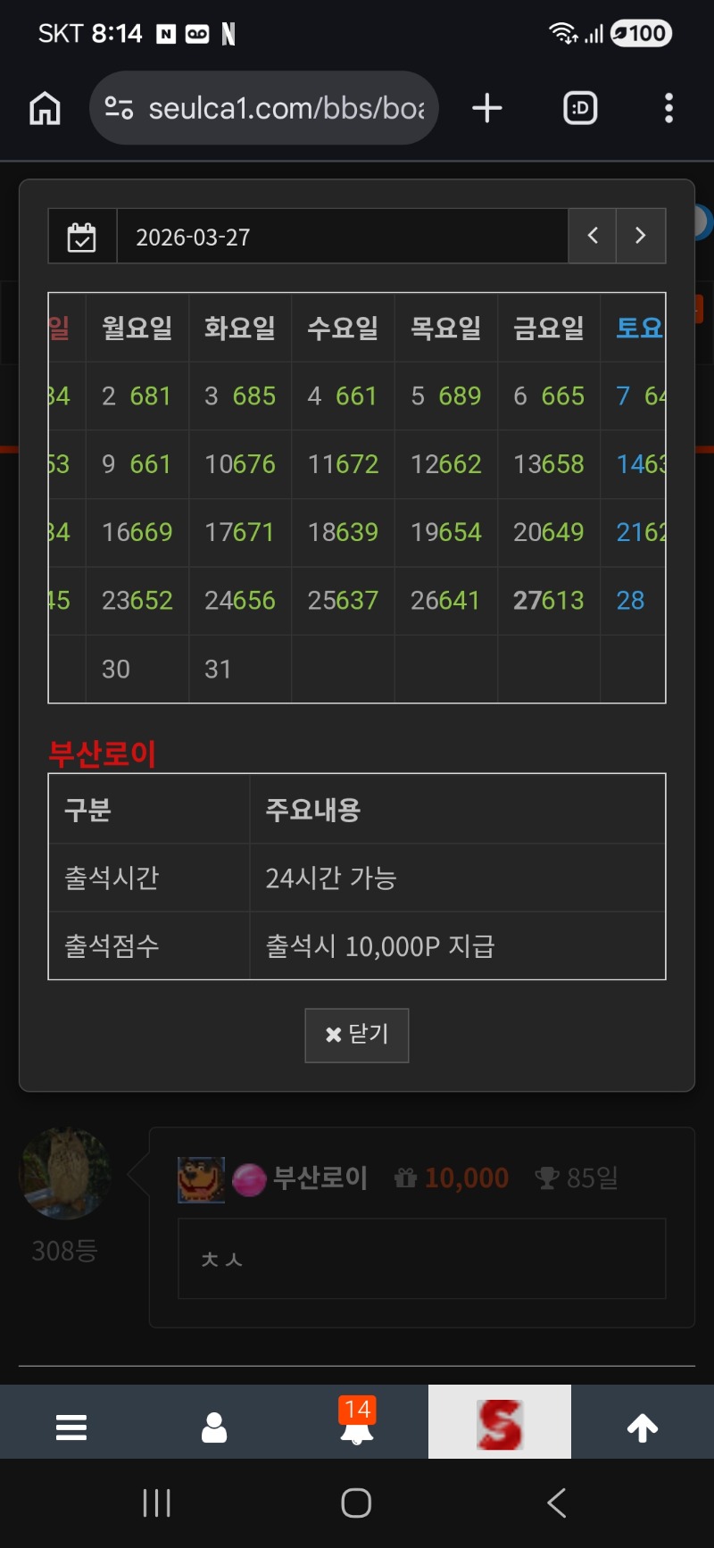 만근가즈아~ 부산로이 1 0 0 20:14:41 *기프티콘 바코드 노출 주의* <- 화이팅! 0 0 https://seulca1.com/bbs/board.php?bo_table=free&wr_id=3727361 Author 0 0 Lv.9 부산로이 9 6,304,328 (57%) 부산로이님 보유 포인트 : P 1,098,044 +1 03.27 만근가즈아~ +15 03.27 사이드 투깡실패 +17 03.27 원깡 성공 +14 03.27 잭잭이 ..까비 +2 03.26 물개 나이스~
