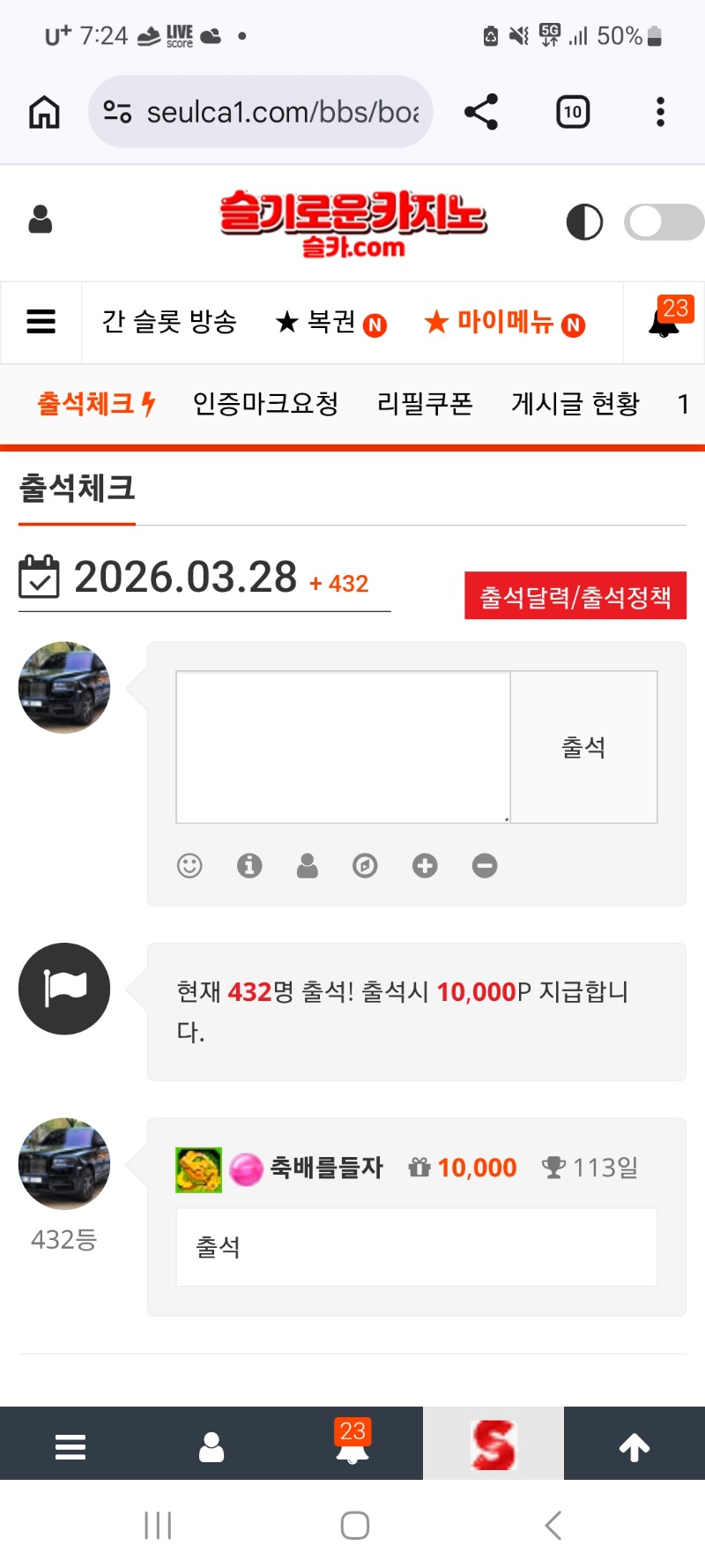 출석 축배를들자 1 0 0 07:25:04 *기프티콘 바코드 노출 주의* <- 출석 체크 0 0 https://seulca1.com/bbs/board.php?bo_table=free&wr_id=3728539 Author 3 0 Lv.12 축배를들자 12 17,095,853 (81%) 축배를들자님 보유 포인트 : P 492,479 +1 03.28 굿모닝입니다 +1 03.28 쌍복출연 +1 03.28 출석 +1 03.27 오늘하루도 수고하셨습니다 +1 03.27 퇴근합니다