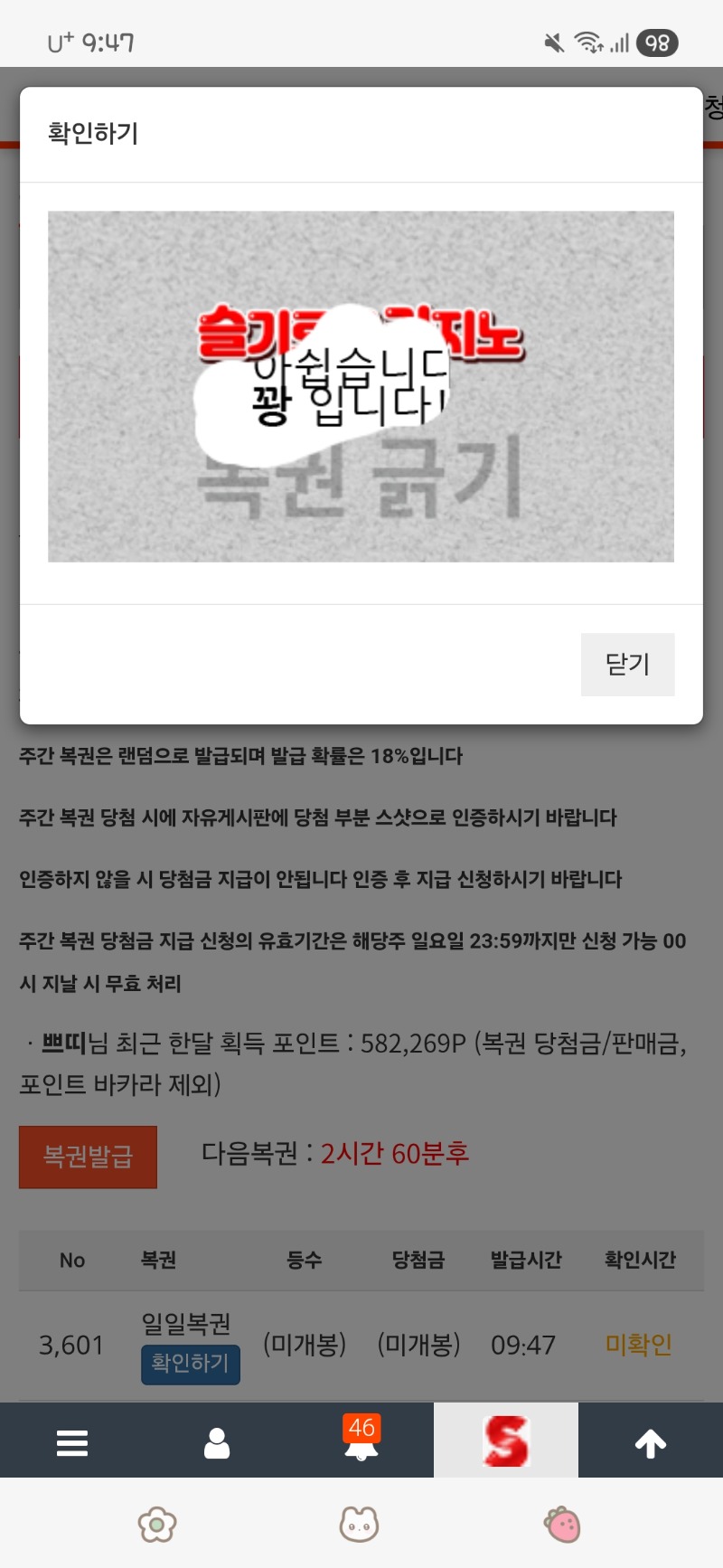 아침 복권 꽝 쁘띠 2 0 0 09:47:42 *기프티콘 바코드 노출 주의* <- 0 0 https://seulca1.com/bbs/board.php?bo_table=free&wr_id=3728784 Author 17 4 Lv.17 쁘띠 17 79,020,035 (30%) 쁘띠님 보유 포인트 : P 2,528,591 +2 03.28 아침 복권 꽝 +6 03.28 출첵 +2 03.28 첫복권 꽝 +4 03.27 주복 팔껄~~~~에잇~~ +4 03.27 마지막 복권 꽝