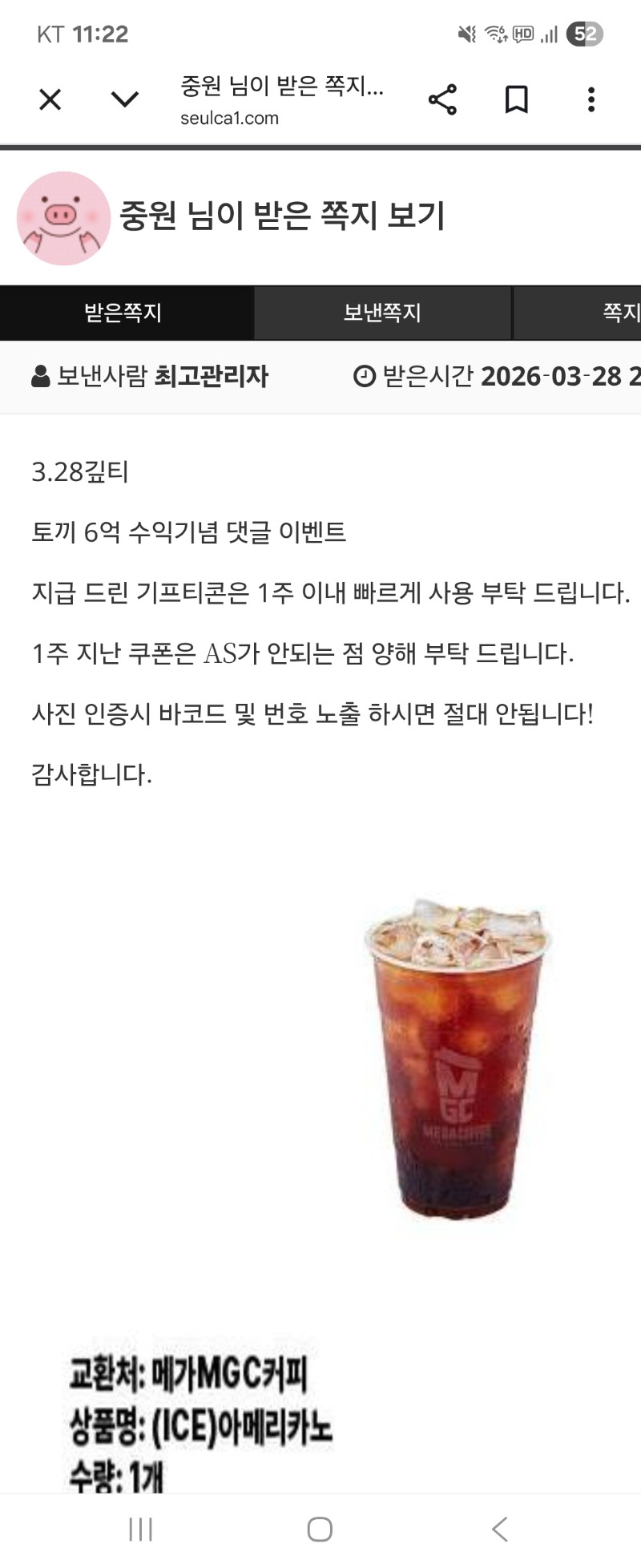 토끼님 수익 기념 커피 감사합니다. 중원 2 0 0 03.28 23:23 *기프티콘 바코드 노출 주의* <- 0 0 https://seulca1.com/bbs/board.php?bo_table=free&wr_id=3730831 Author 0 0 Lv.11 중원 11 10,696,408 (23%) 중원님 보유 포인트 : P 559,518 +1 03.28 [비밀글] 복권 당첨 지급 신청입니다 +1 03.28 [비밀글] 포인트 교환 신청입니다. +2 03.28 토끼님 수익 기념 커피 감사합니다. +1 03.28 좋은 주말 아침입니다 ~ +1 03.27 출석합니다