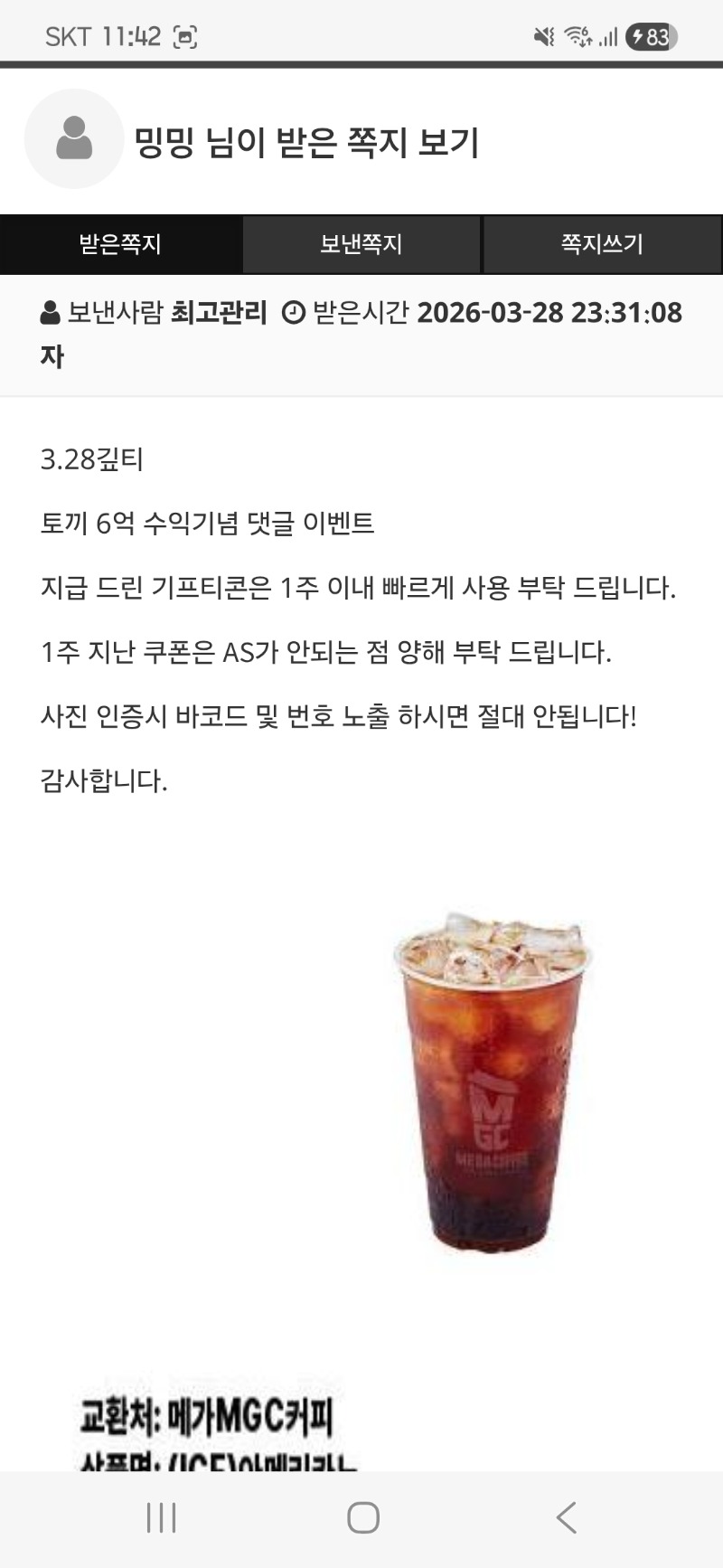 토끼 수익기냠 컵피 ~~ 밍밍 1 0 0 03.28 23:43 *기프티콘 바코드 노출 주의* <- 감사합니더 ㅎㅎㅎ 잘마실게용! 0 0 https://seulca1.com/bbs/board.php?bo_table=free&wr_id=3730874 Author 0 0 Lv.7 밍밍 7 2,124,848 (12%) 밍밍님 보유 포인트 : P 2,040,456 +1 03.28 다들 굿밤이요ㅎㅎ +1 03.28 토끼 수익기냠 컵피 ~~ 03.28 로또 당첨 되신분들 축하합니다 ㅎㅎㅎ +3 03.28 어제 진짜 무슨일이야...? +12 03.27 뱀피 129