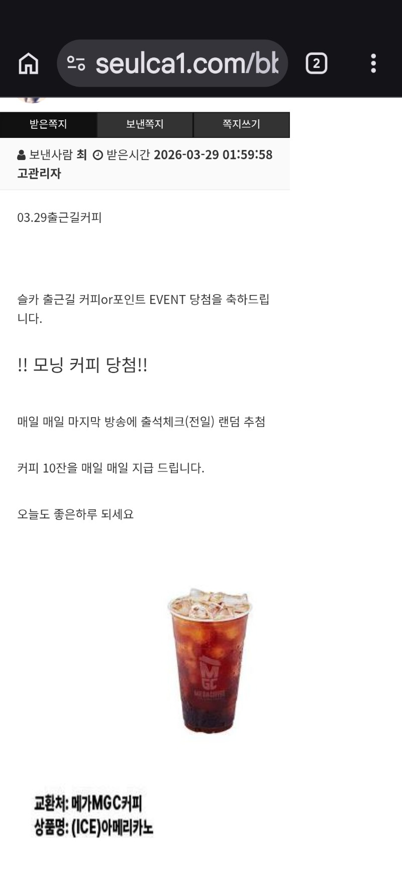 출근길 모닝커피 당첨 ㅅㅅㅅ 까치독사 2 0 0 03:05:47 *기프티콘 바코드 노출 주의* <- 0 0 https://seulca1.com/bbs/board.php?bo_table=free&wr_id=3731223 Author 1 0 Lv.7 까치독사 7 2,184,703 (18%) 까치독사님 보유 포인트 : P 567,350 +2 03.29 출근길 모닝커피 당첨 ㅅㅅㅅ 03.29 방송보다 보니 하루가 다 지나갔네 ㅋ +4 03.28 한화 선취점 나왔네요 !! +42 03.28 펑크 토일렛 894배 +55 03.28 스보천 일반구매 1789배