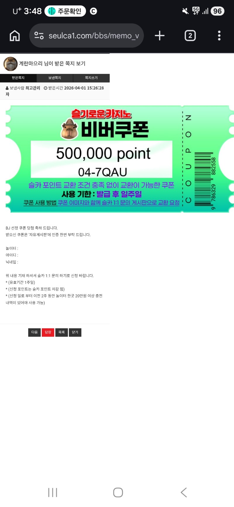 비버오빠 추겜슈우우웃~ 계란마으리 14 0 0 16:30:54 *기프티콘 바코드 노출 주의* <- 랑오빠는 수익 마니ㅜ못봐서 실패!!! 비버오빠 에서 터져서 비쿱 겟 ㅋㅋㅋㅋㅋ 좋는곳에 잘쓰것슴다 0 0 https://seulca1.com/bbs/board.php?bo_table=free&wr_id=3744060 Author 12 6 Lv.15 계란마으리 15 37,340,564 (36%) 계란마으리님 보유 포인트 : P 4,578,637 +4 04.01 똔부장님 추겜 성공! +14 04.01 비버오빠 추겜슈우우웃~ +24 04.01 이리오빠 진짜안하고잇엌ㅋㅋㅋㅋㅋㅋ +7 04.01 나인 이벤트머니~_~ +3 04.01 육각형 치킨집을 발견함