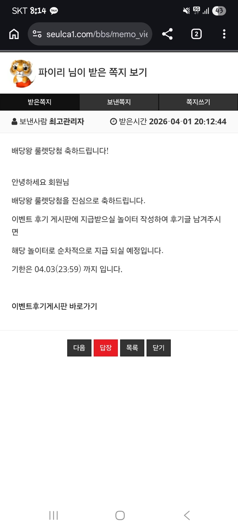 배당왕 룰렛 당촘!! 파이리 17 1 0 20:16:04 *기프티콘 바코드 노출 주의* <- 근1년째 배당왕 입상은 못하고있지만! 룰렛으로 사자가 1번 양이아부지가 2번이나 뽑아줬네요 감사합니다!!! 1 0 https://seulca1.com/bbs/board.php?bo_table=free&wr_id=3744795 Author 3 1 Lv.13 파이리 13 18,655,933 (13%) 파이리님 보유 포인트 : P 5,600 04.01 이걸 2대1로지네 ㅋㅋㅋㅋㅋ +6 04.01 배당왕 룰렛 후기 +16 04.01 배당왕 룰렛 입금완료됐네요~ +6 04.01 이모~ +17 04.01 배당왕 룰렛 당촘!!