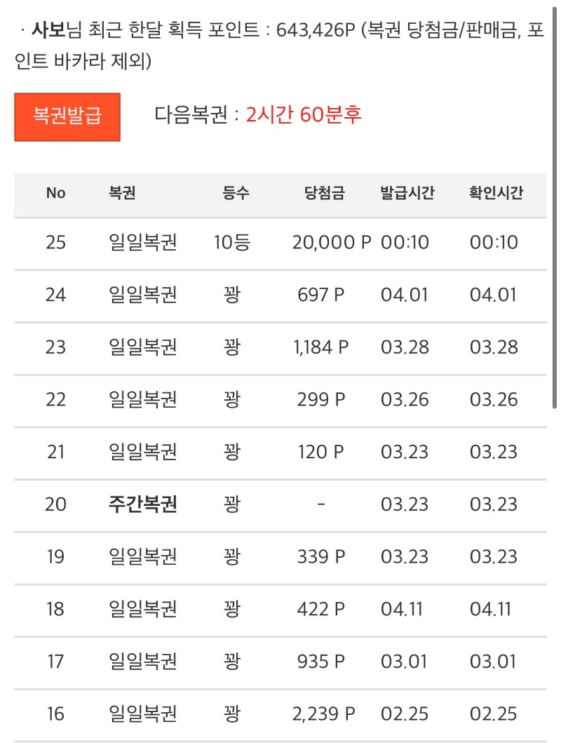 일복 첫당첨 !!! 사보 2 0 0 00:11:49 *기프티콘 바코드 노출 주의* <- 주복1등 되고싶읍니다 0 0 https://seulca1.com/bbs/board.php?bo_table=free&wr_id=3745361 Author 1 0 Lv.6 사보 6 1,247,188 (24%) 사보님 보유 포인트 : P 526,765 +17 04.02 카라박 마틴 3연패 +21 04.02 카라박 마틴 2연패 +18 04.02 카라박 1패 +2 04.02 일복 첫당첨 !!! +1 03.26 [비밀글] 50포교