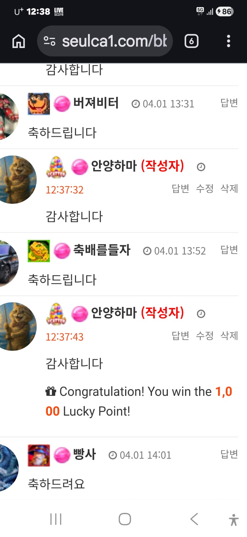 럭포1000점 첨봄 ㅎㅎ 안양하마 10 0 0 12:45:00 *기프티콘 바코드 노출 주의* <- 0 0 https://seulca1.com/bbs/board.php?bo_table=free&wr_id=3746747 Author 3 1 Lv.16 안양하마 16 65,224,162 (76%) 안양하마님 보유 포인트 : P 949,821 +4 04.02 식후 편의점 아아 한잔 ㅎ +10 04.02 럭포1000점 첨봄 ㅎㅎ +6 04.02 맛점하세요 +15 04.02 모닝라이트닝 네츄럴 마물승 역시 소액은 잘 맞어ㅎ +11 04.02 모닝라이트닝 네츄럴승ㅎ