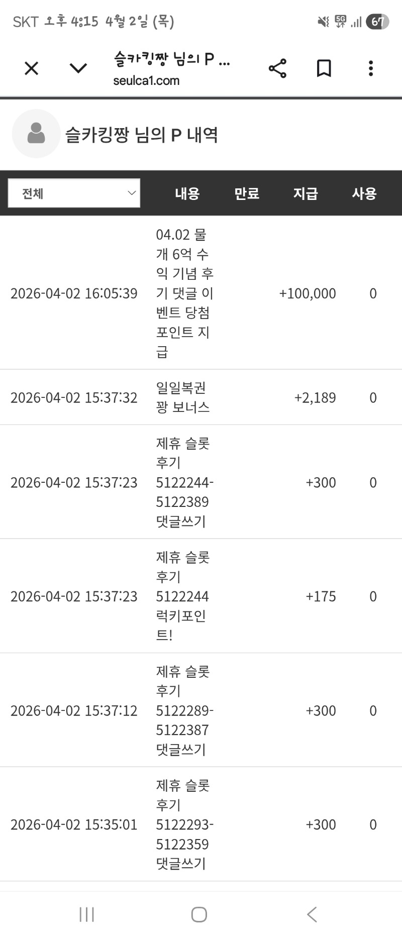 물개 수익포인트 감솨감솨~~~ 슬카킹짱 1 0 0 16:16:17 *기프티콘 바코드 노출 주의* <- 0 0 https://seulca1.com/bbs/board.php?bo_table=free&wr_id=3747236 Author 1 1 Lv.12 슬카킹짱 12 16,230,973 (64%) 슬카킹짱님 보유 포인트 : P 769,378 +1 04.02 물개 수익포인트 감솨감솨~~~ +17 04.02 뱀피 327배 +8 04.02 오라메 112배 +2 04.02 다들 맛점들 하세용~~~ +6 04.02 오라메 287배